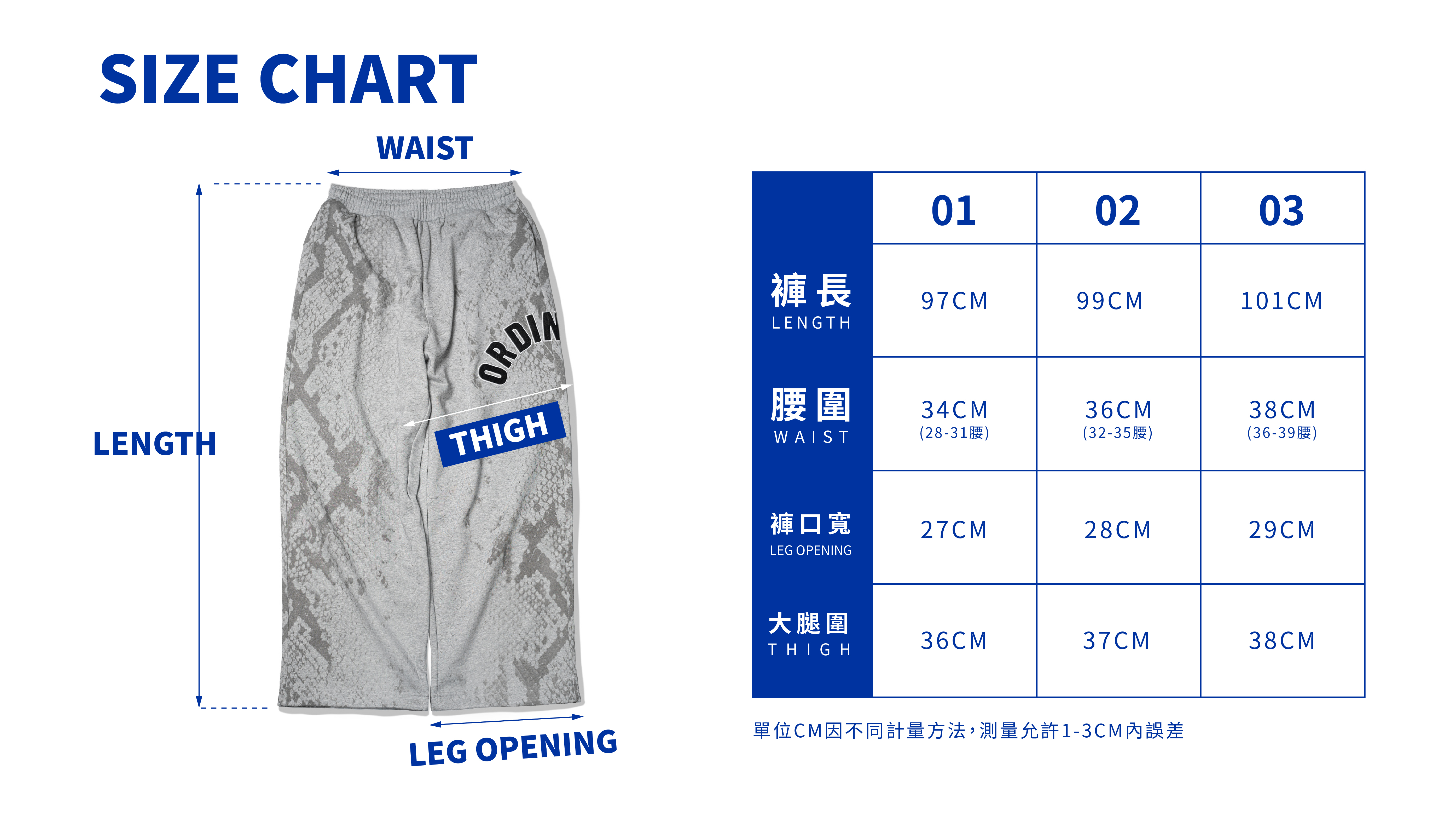 01: 褲長97cm / 腰圍34cm / 大腿圍36cm / 褲口寬27cm