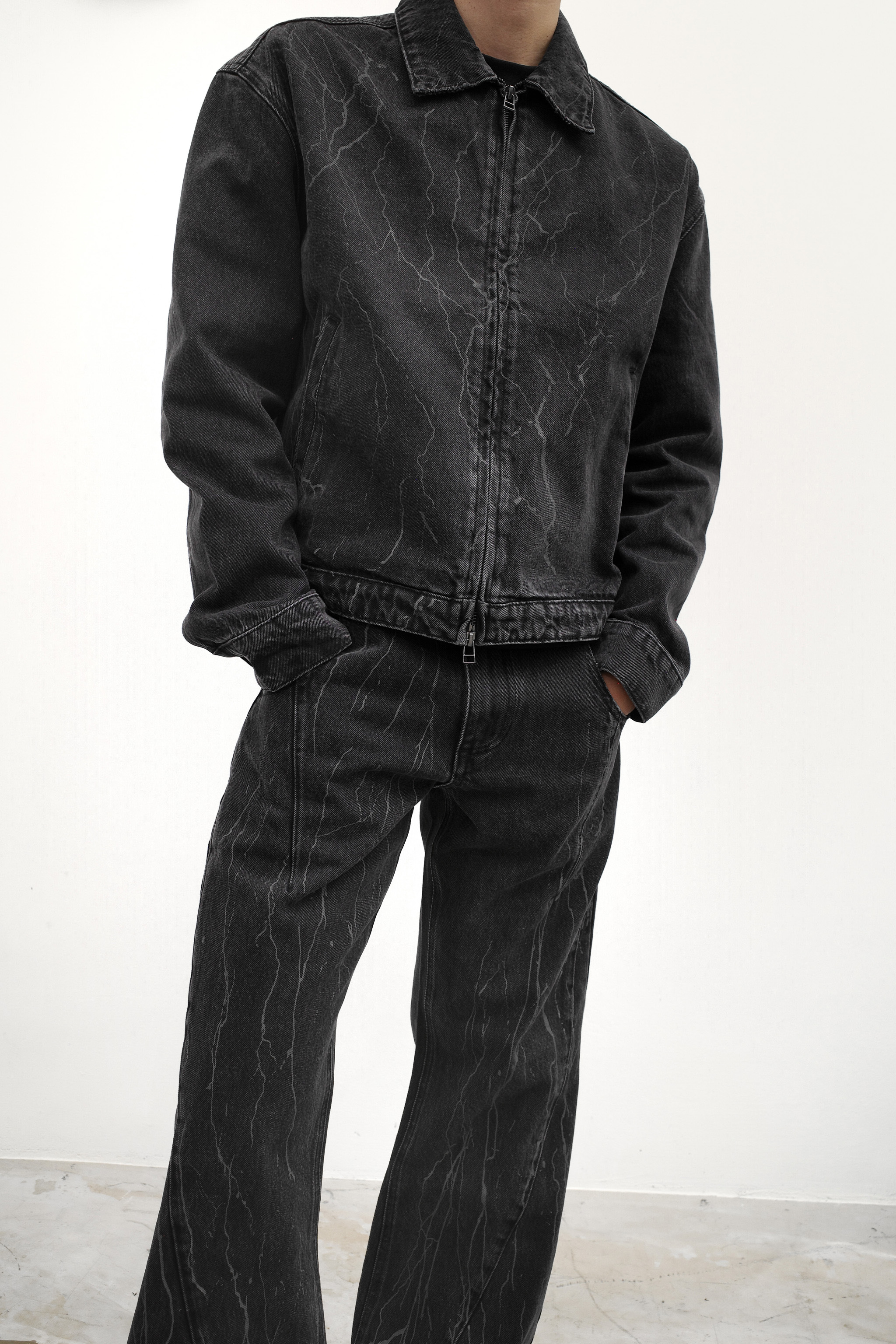 F25-J01 Zip-Up Denim Jacket 採用激光雷射工藝結合洗水處理,打造層次豐富的丹寧質感。雙頭拉鍊設計提升造型變化與穿著便利,寬短版剪裁展現俐落街頭風格。