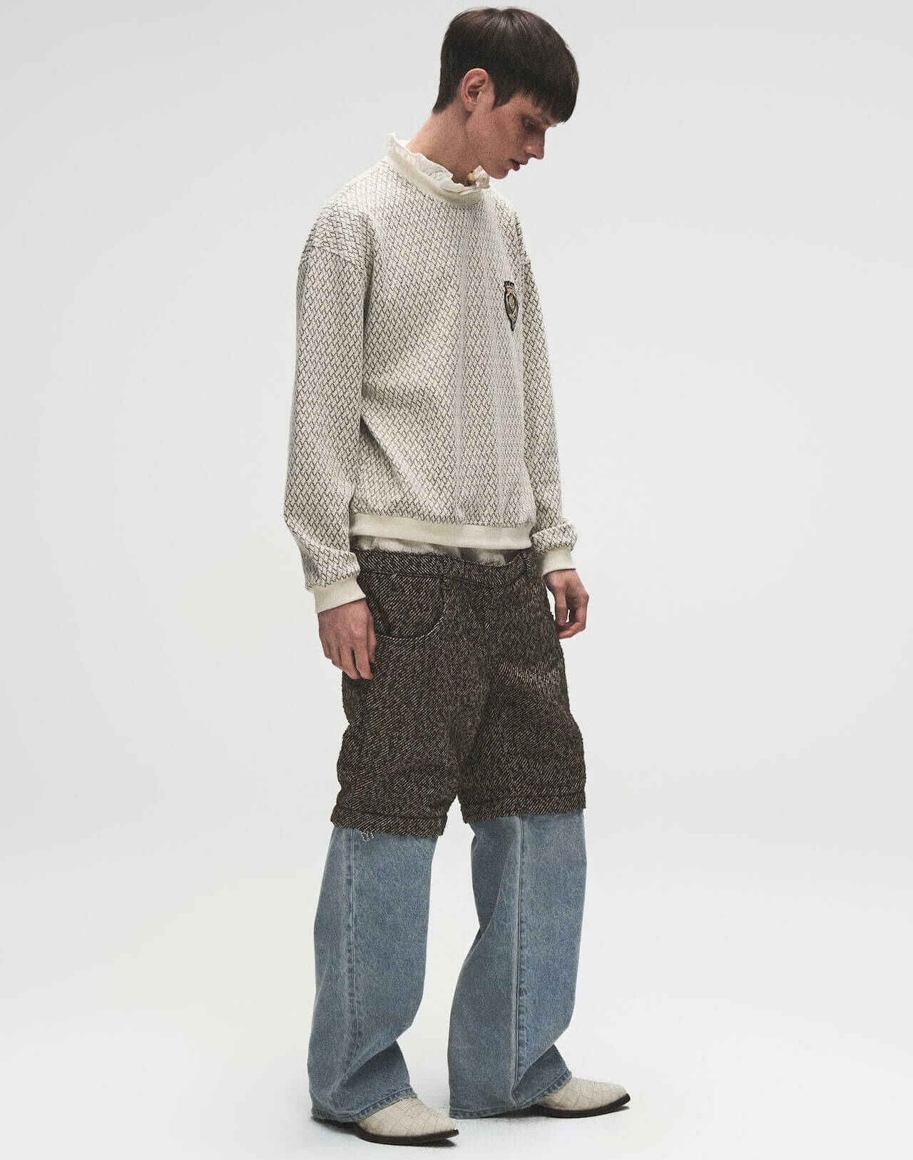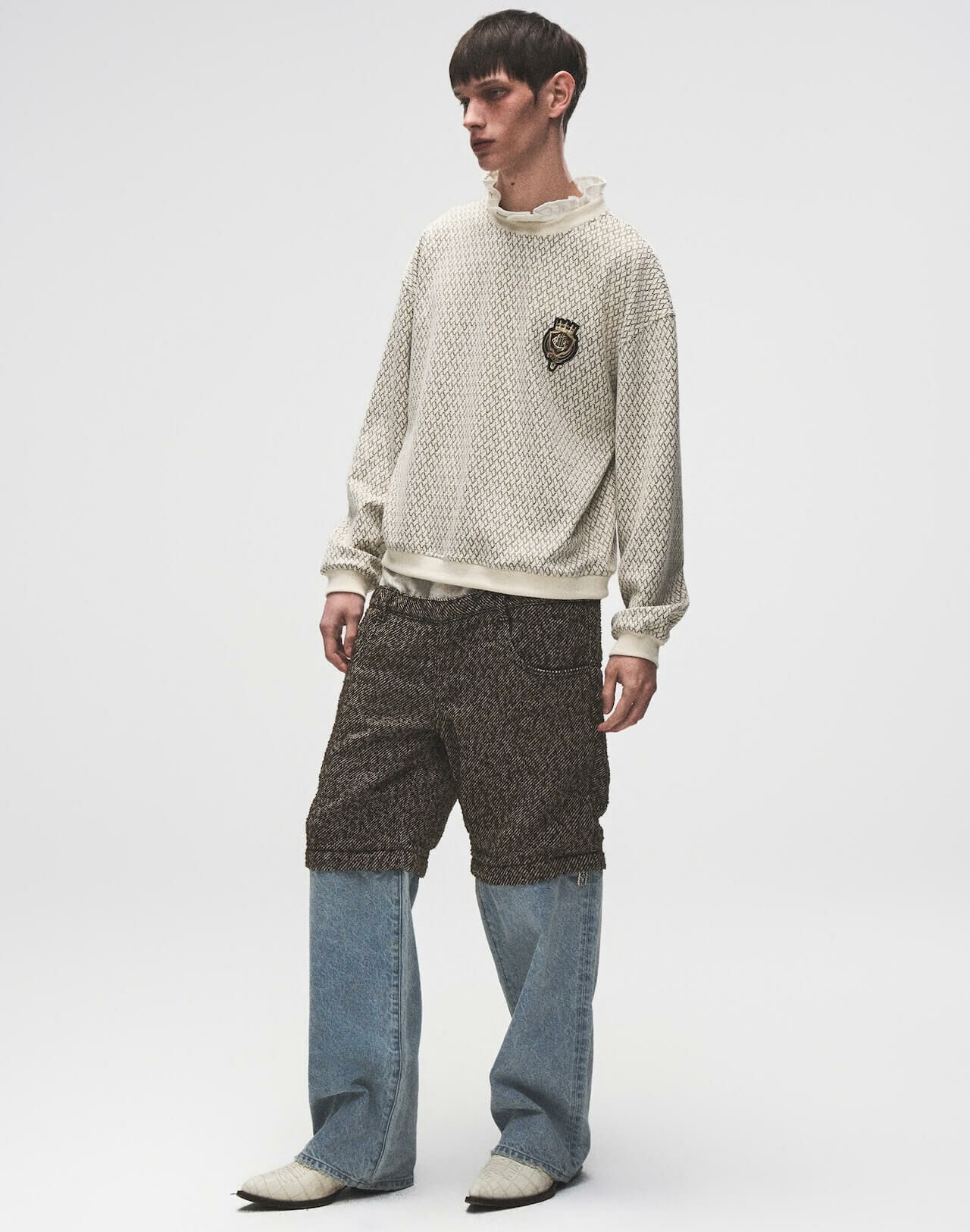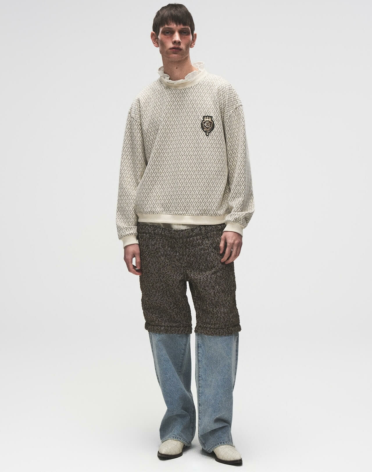靈感來自歐洲貴族風格,這款衛衣以華麗的細節呈現現代高雅氣息,宮廷風白色翻領與金色提花面料的搭配展現優雅格調。