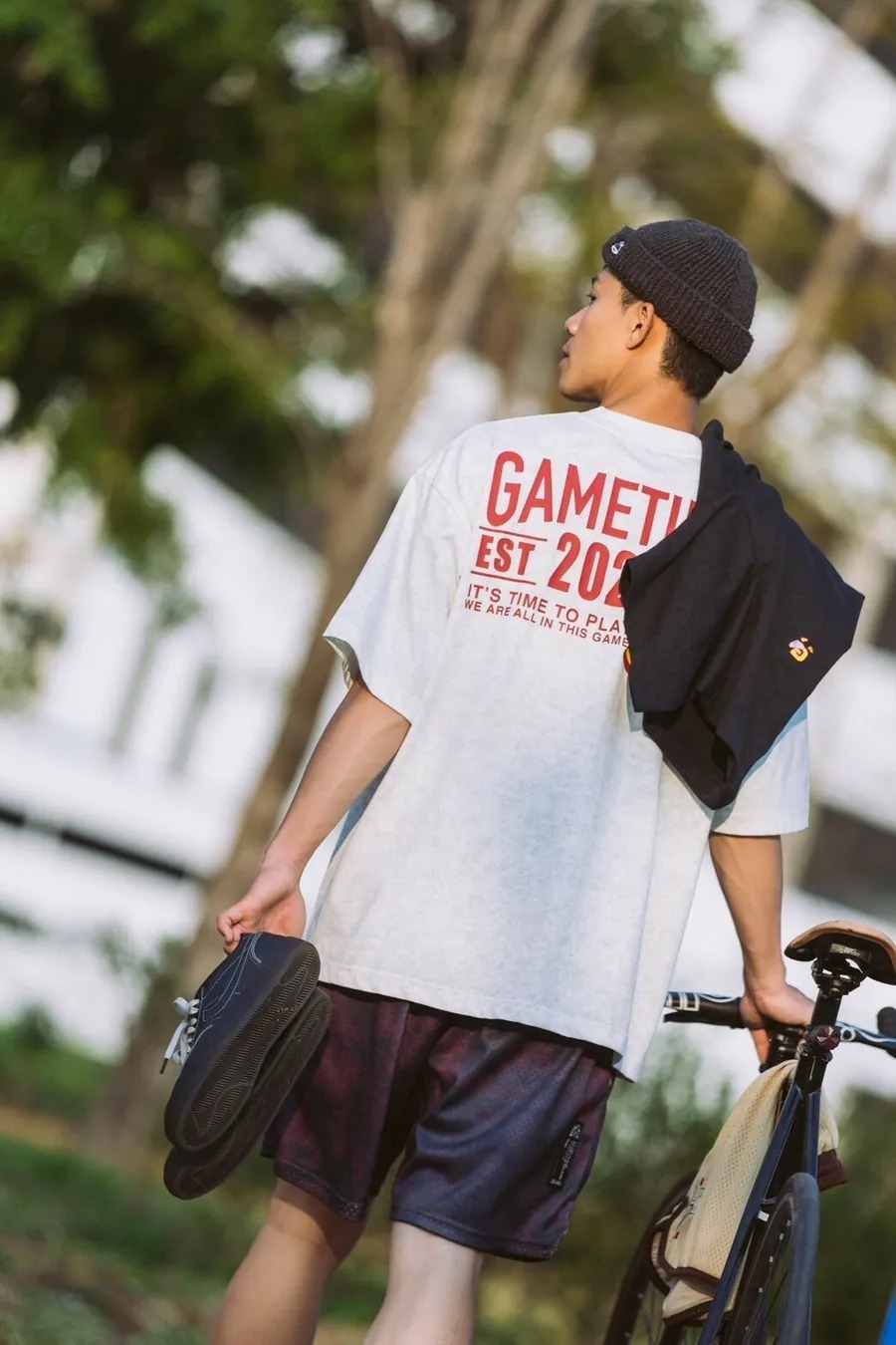 本次GAMETIME開季T-shirt以美式復古風格為設計靈感,主體面料採用蠟染工藝,營造出濃厚的復古氛圍,並巧妙融入美式插圖元素。在細節設計上,正面左胸位置加入字母G插畫角色,並以精緻的刺繡呈現。背面則運用了美式廣告排版風格,大文字排版巧妙結合字母G插畫角色,與正面設計相呼應,營造出和諧的復古風格。