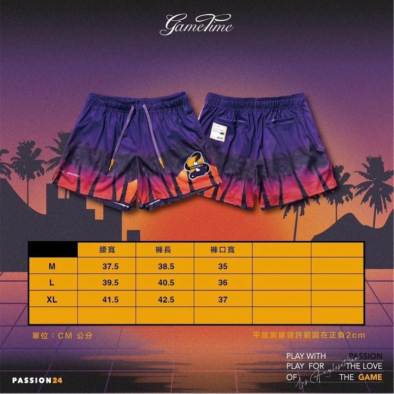 結合 PASSION 24 的紫黃色品牌主色系,球褲設計則展現加州夕陽、棕櫚樹等經典元素,並在GAMETIME 的 G 字 Logo 上纏繞刺繡的 PASSION 24曼巴蛇,向那些最努力的球員致敬。