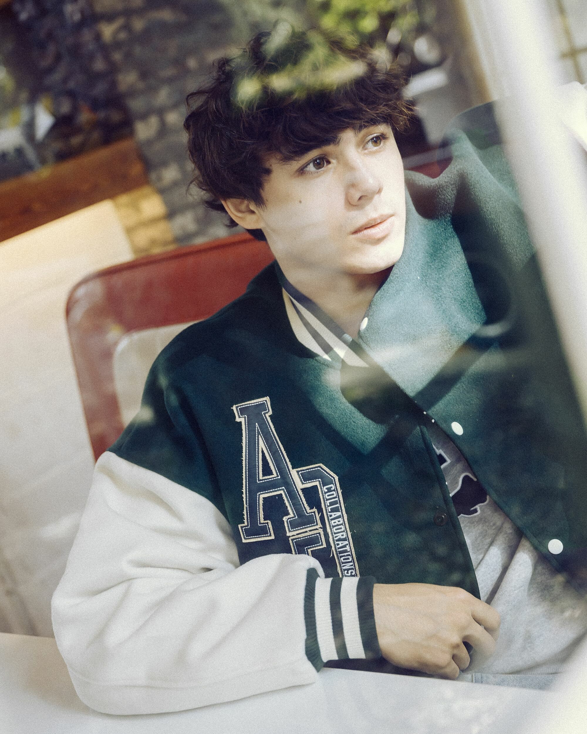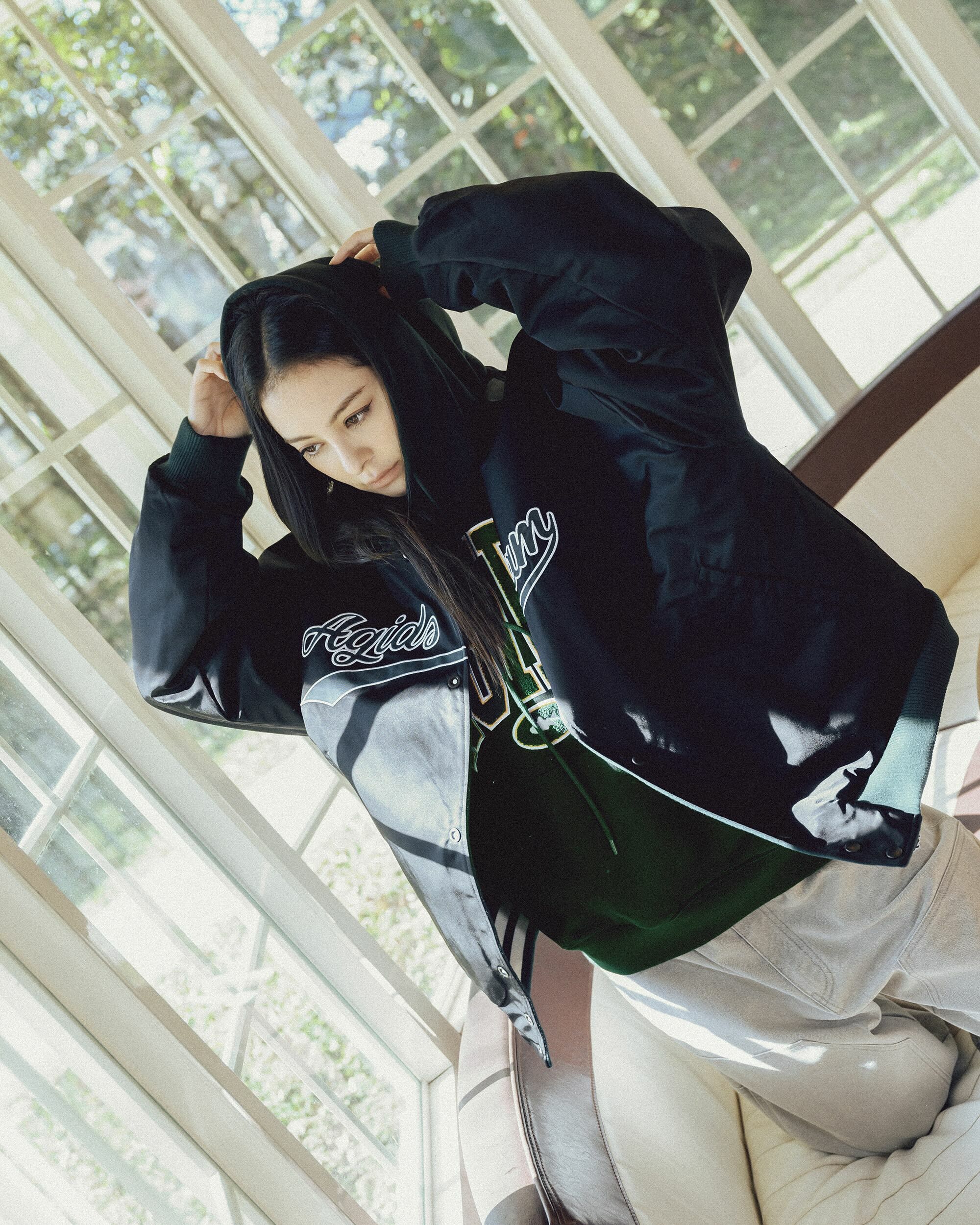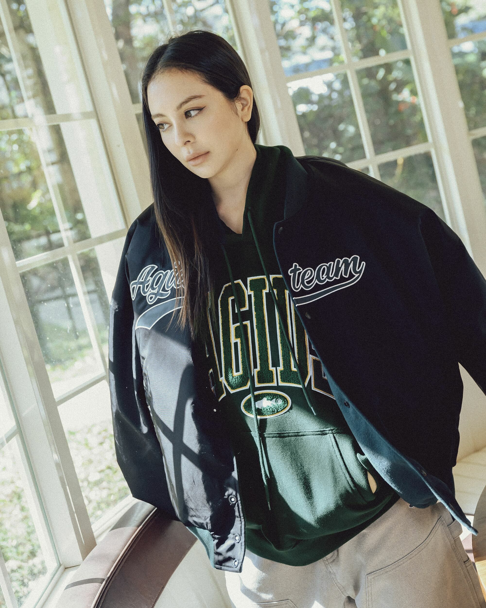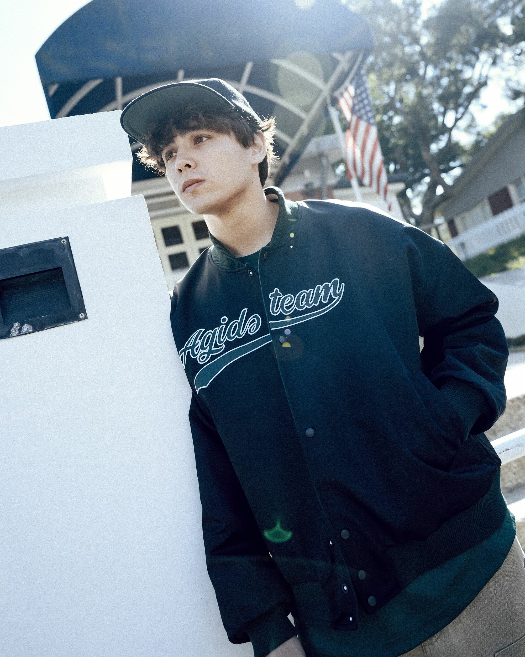 棒球外套以雙面穿著為構思,羔毛面貼布字使用不修邊的方式進行,