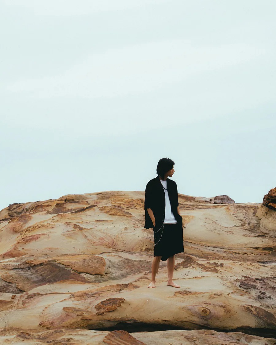 在結構上以切割拼接方式進行,呼應斷裂與重疊,表達出一種抽象的轉譯,每一道拼接,就像是礦石經過時間的淬煉,帶著自然的力量,同時也賦予穿著者一種穩堅定而柔軟的意象。