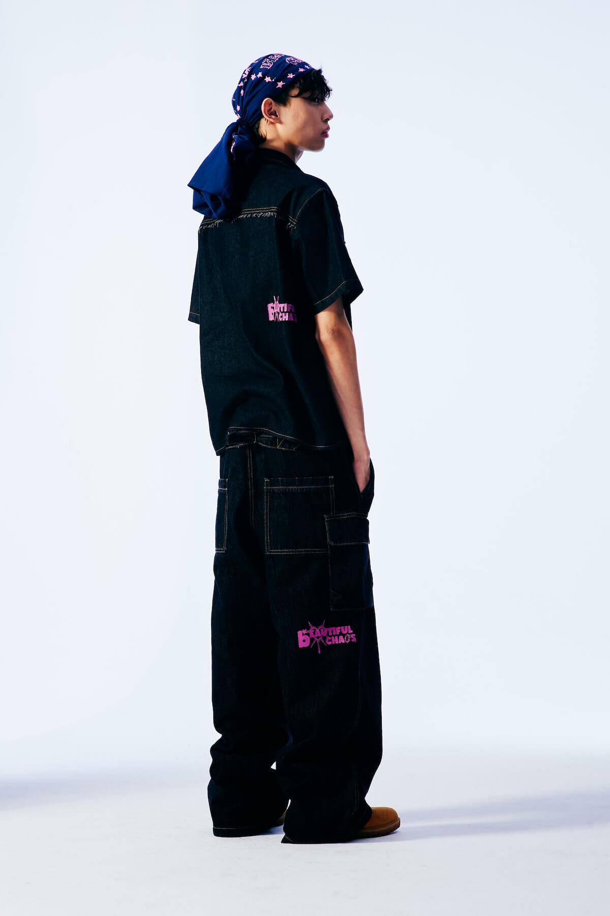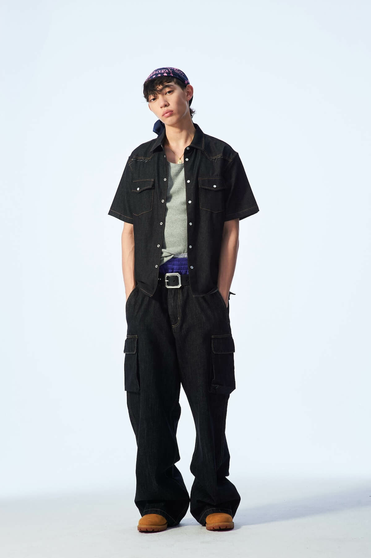 結合夏日西部風格與街頭風格的寬鬆剪裁短袖襯衫,採用牛仔布料,胸前配有珍珠壓扣與雙口袋設計,細節處做出仿舊破壞,展現不羈個性與復古態度。