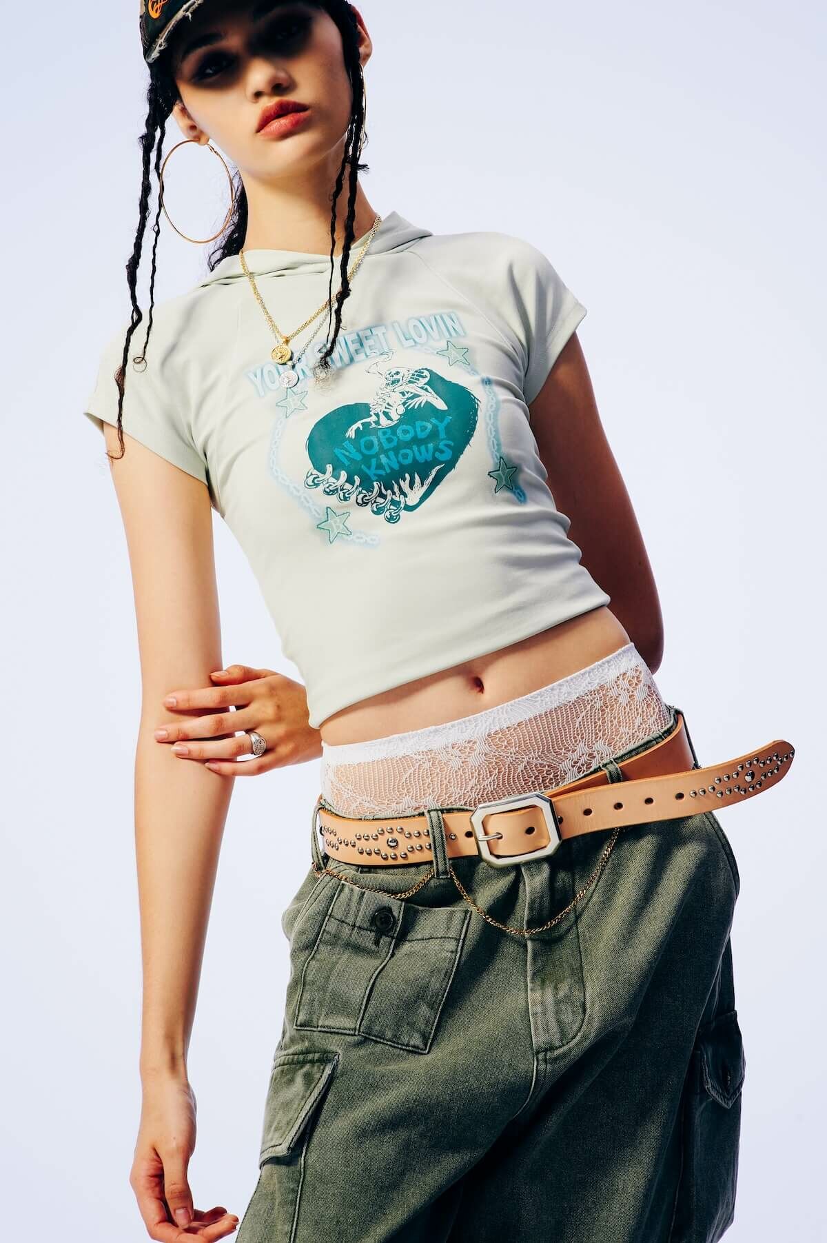 彈性布料製成,胸前印有 “YOUR SWEET LOVIN” 文字與愛心塗鴉圖樣,搭配大帽剪裁與領口開口設計,整體做仿舊處理,呈現濃厚夏日復古氛圍。