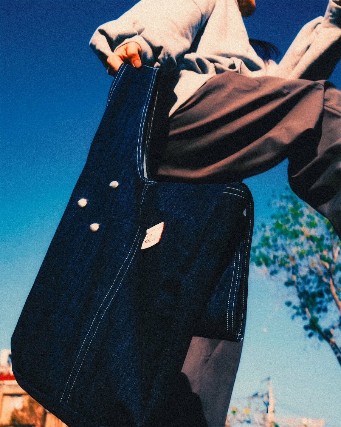 全手工製作的丹寧包,選用經典深靛藍丹寧面料,搭配三顆金屬鉚釘與對比縫線,展現工藝與街頭質感的結合。