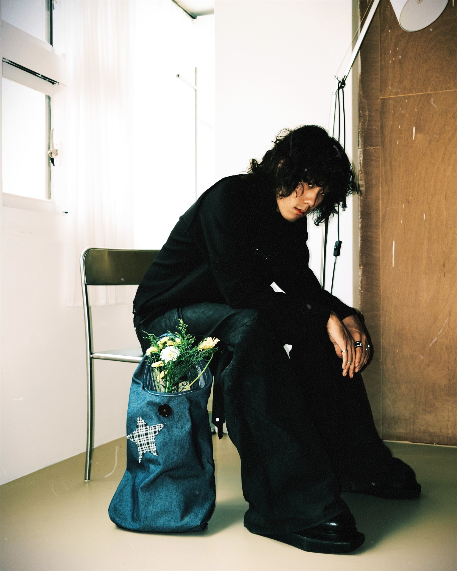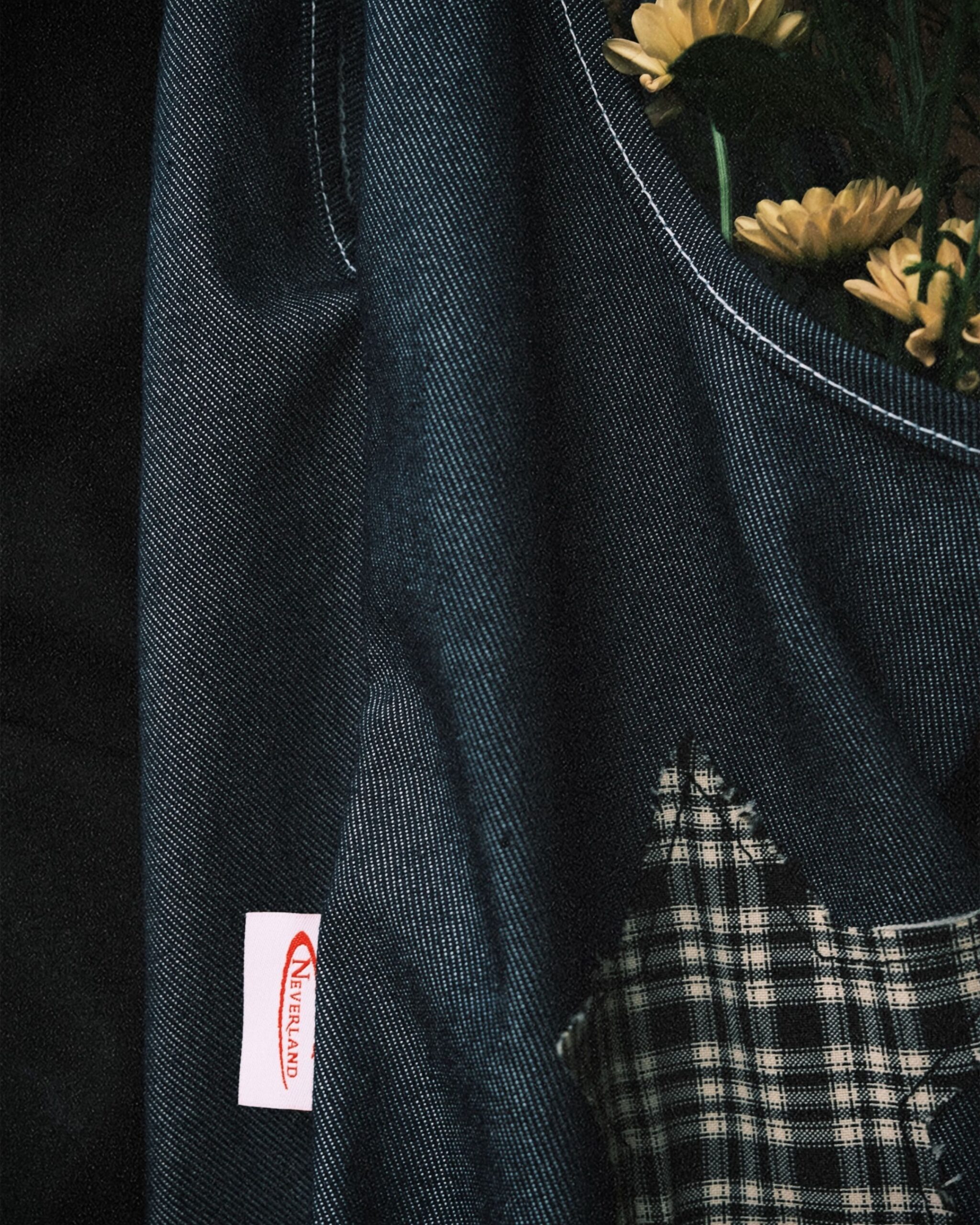 採用一體成型工法,袋身線條俐落簡潔。前後以手工剪裁與刷破星星拼布打造層次,展現獨特工藝感。提把以牛仔本布包邊並加壓固定,提升手感與穩定度。手工毛線固定大鈕扣設計,防止物品滑出。格紋、毛邊星星與牛仔布交織出兼具可愛與實用的風格。