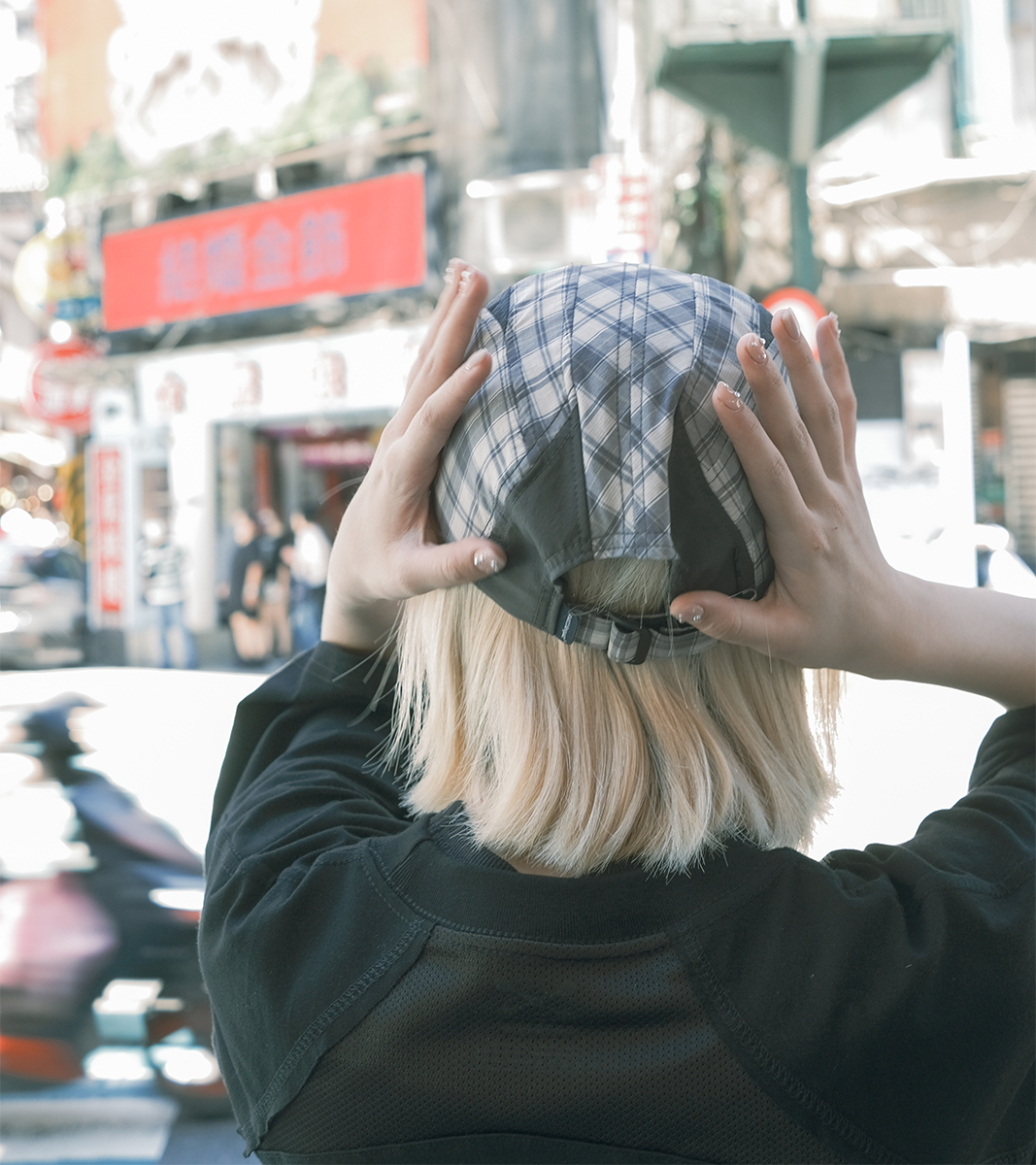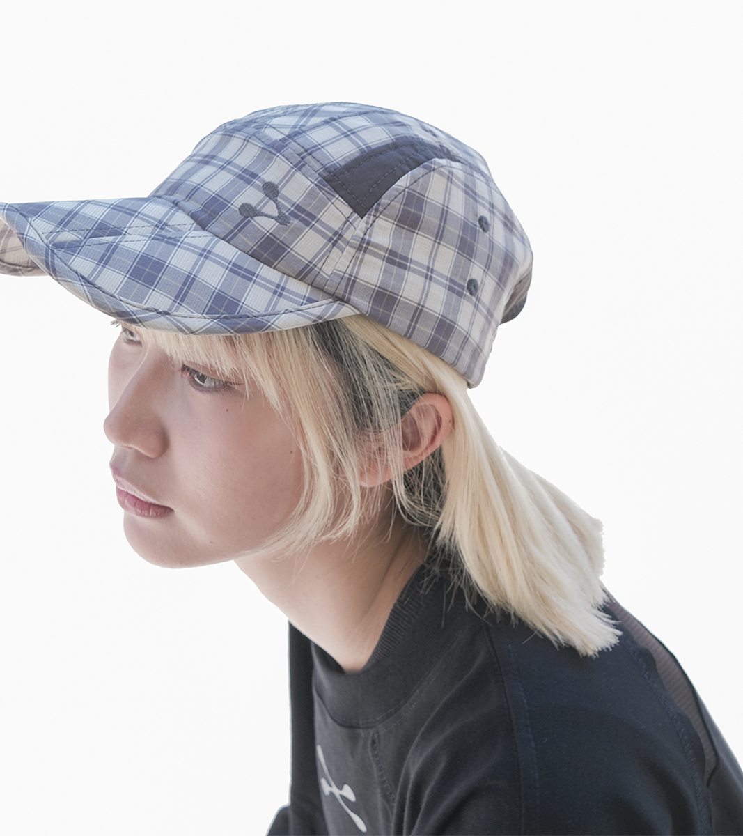 帽身使用彈性透氣尼龍布料,其中一色採用 nozzle quiz 首次嘗試的高調格子布料,
