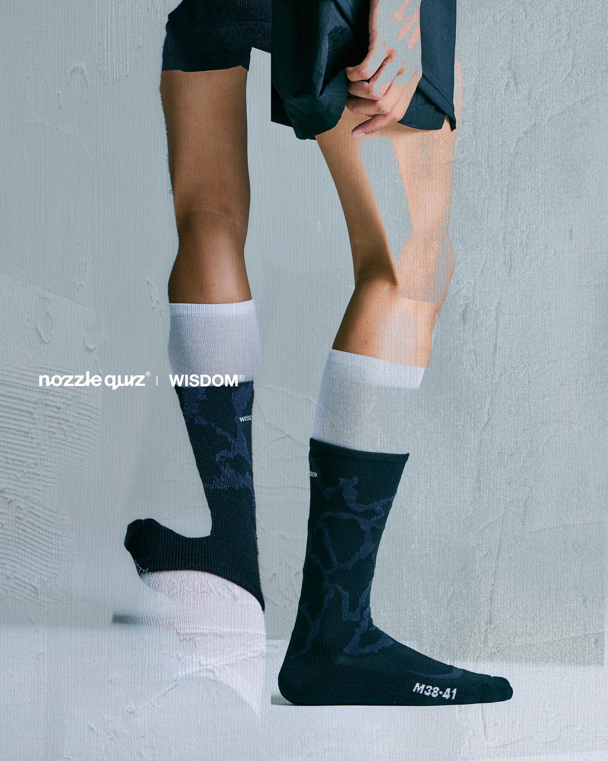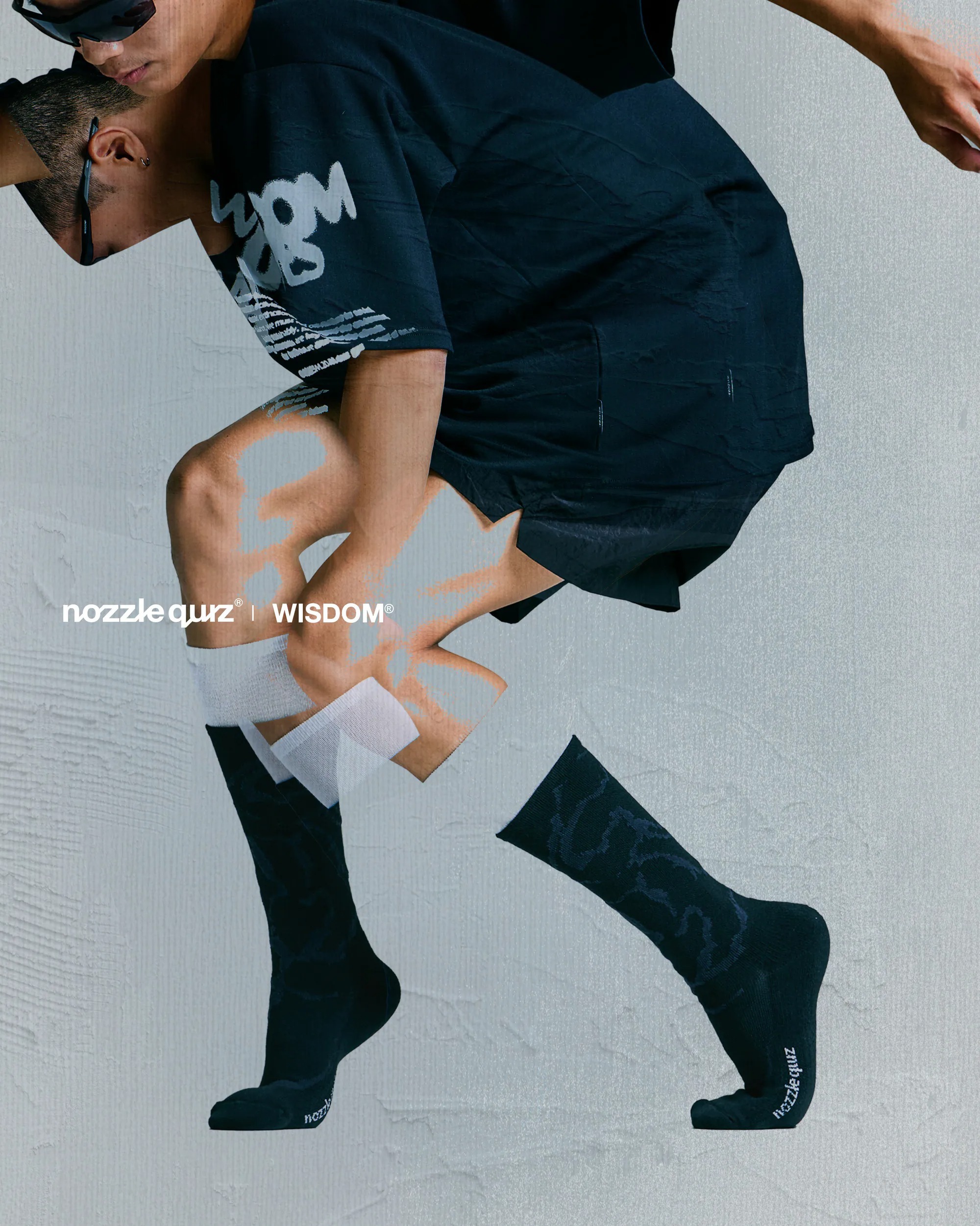 WISDOM® 2025 特別製作,攜手 nozzle quiz® 共同打造機能襪款。選用 CoolTouch™ 功能紗線,提供高效的吸濕排汗與抗起毬性能,兼顧穿著舒適與耐用表現。設計上以全黑襪體為基底,注入聯名限定的金屬液態線條,搭配 WISDOM® 刺繡標誌、襪底 nozzle quiz® 字樣與尺寸提花,讓每個角度都展現講究的細節。
