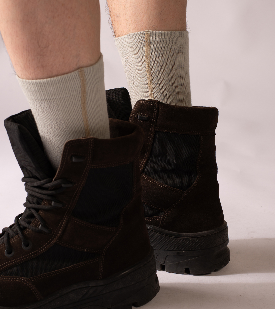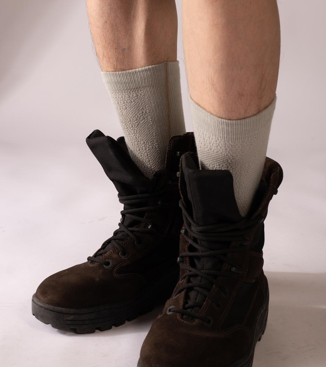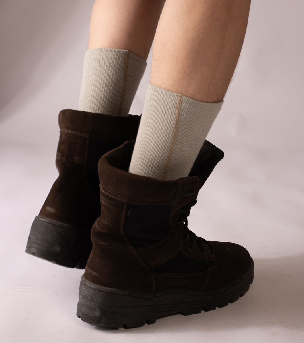 另一方面,特殊任務需求之外,平時城市居民也會配備帶有個人特色的私人裝備。這款不知從何時流入市面的車線襪款,其厚薄度恰巧適合當地的氣候,細節處包含側邊線條及整體結構都可見一斑。根據 nozzle quiz 公司內部資料揭示,這雙襪款的側邊車線是向服裝部門借鑑使用的一種技法稱作"Flat-sew",能夠加固服裝的穩定性,但沒有人知道當時裝備部們的設計人員為何使用它,這是一個謎。