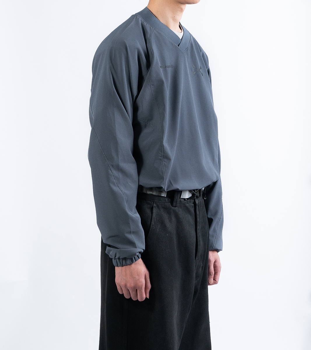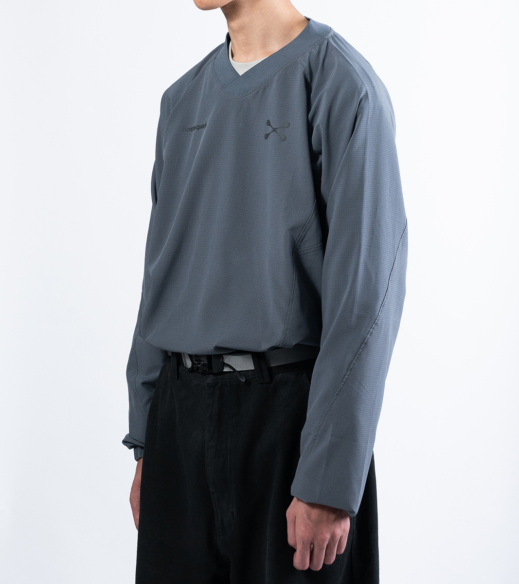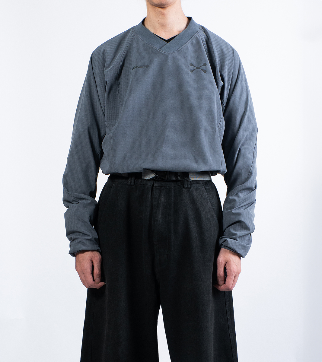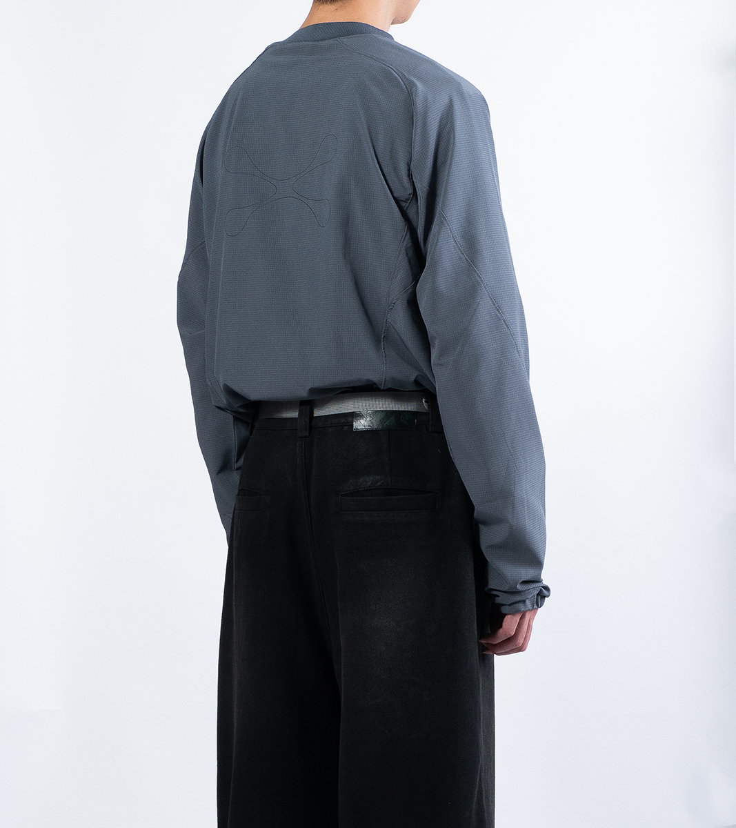 作為本季度獨走的布料款式,配有強調舒適與排濕性能的特色機能布,本布以水溶紗融合織造,以特定溶劑溶解後,提供多孔洞的特性,形成柔軟親膚的布料特性,可做為輕薄的外層搭配使用。