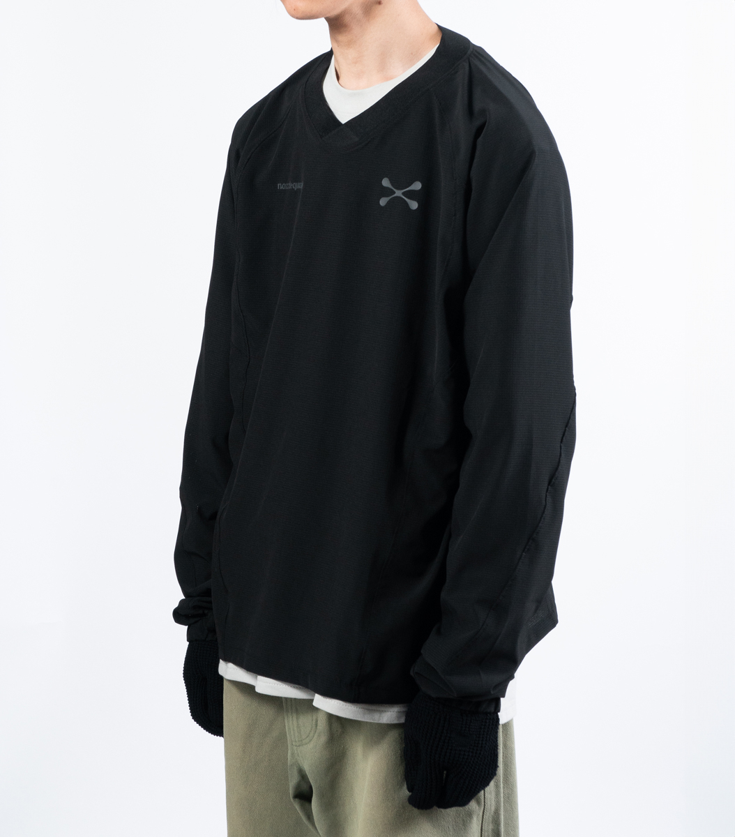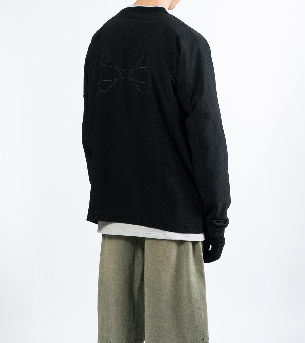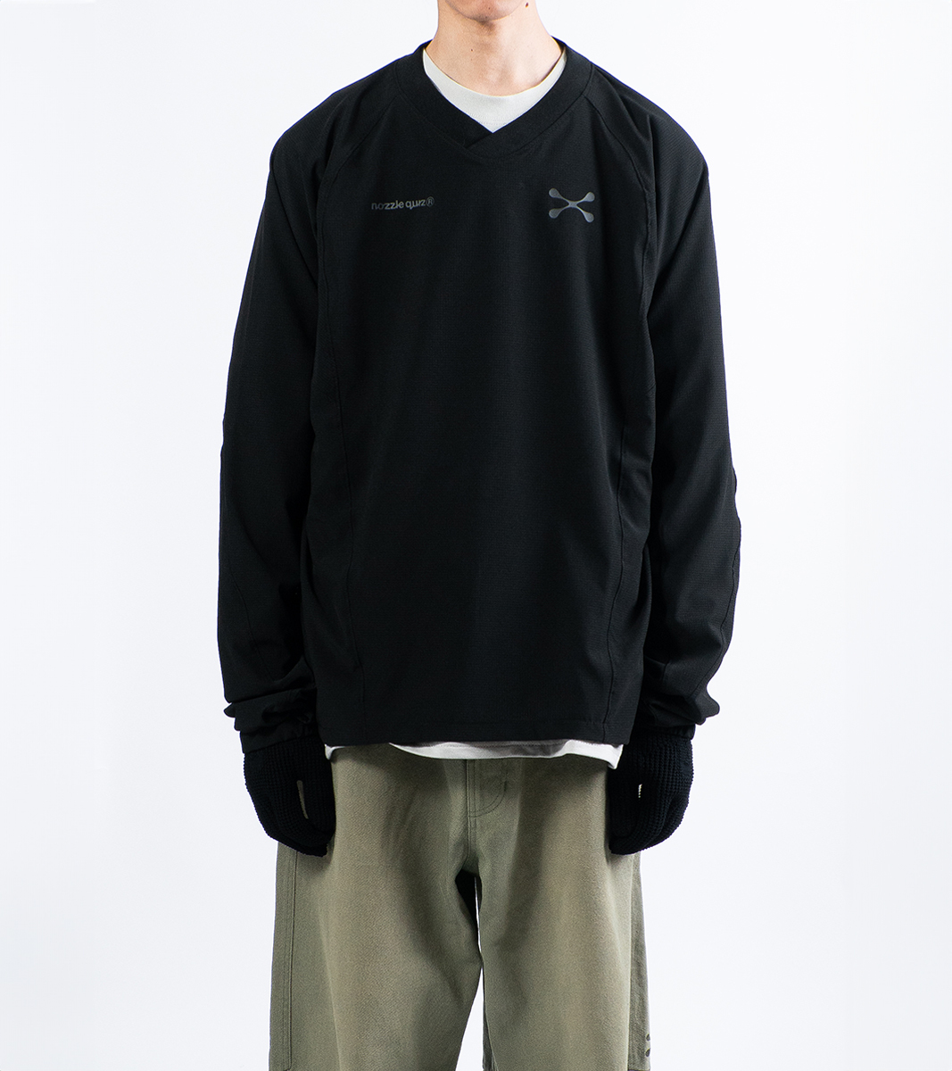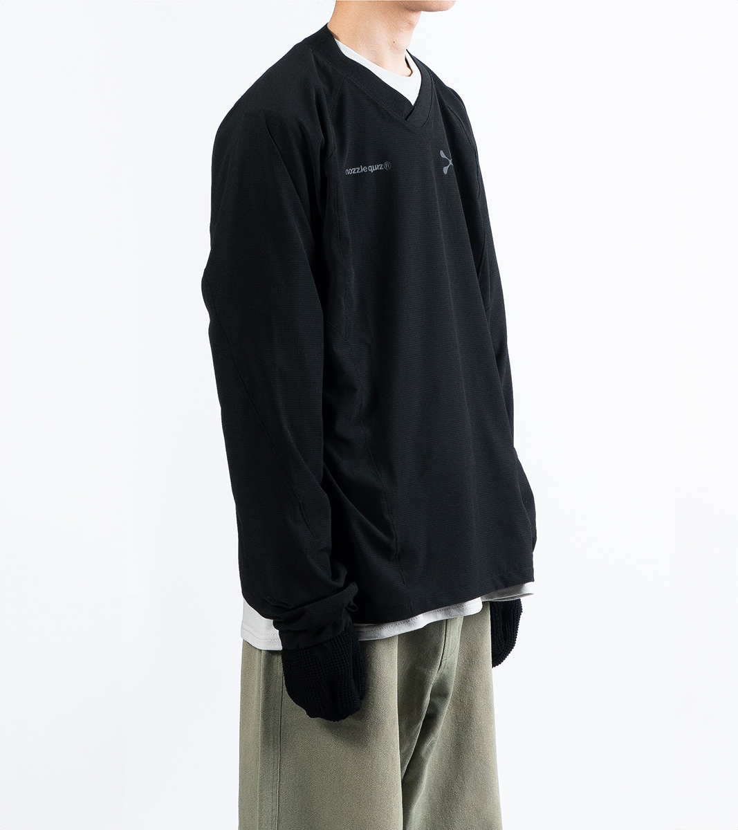 作為本季度獨走的布料款式,配有強調舒適與排濕性能的特色機能布,本布以水溶紗融合織造,以特定溶劑溶解後,提供多孔洞的特性,形成柔軟親膚的布料特性,可做為輕薄的外層搭配使用。版型與 Solid Football Tee 一致,本款以 Flow 為名,提供截然不同的穿著體驗。前胸採用了首次引用的立體膠印技術,印上標誌的品牌 LOGO 與品牌名,象徵性地成為 nozzle quiz 的一名球員。後背則印有大尺寸的鏤空 LOGO 印花,並且加入了拇指岔片的設計,在秋冬季度能夠更加靈活地作為造型搭配使用。
