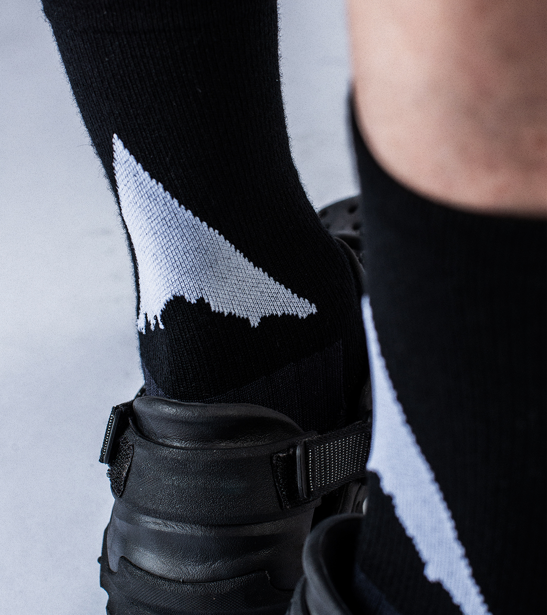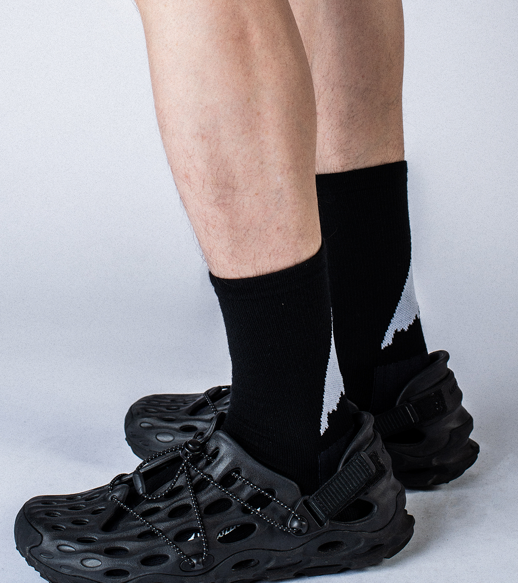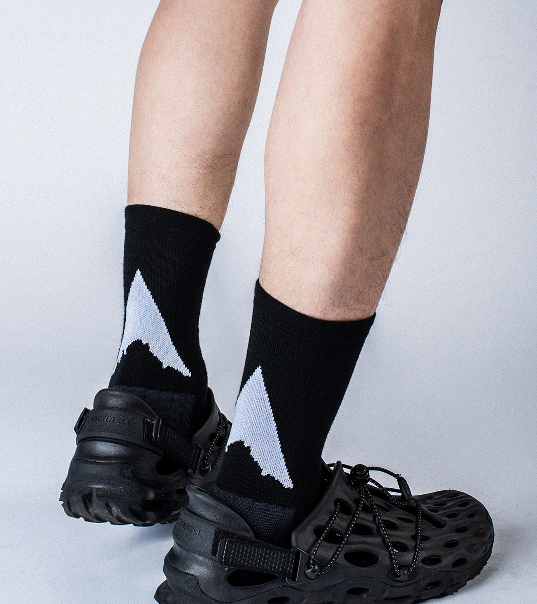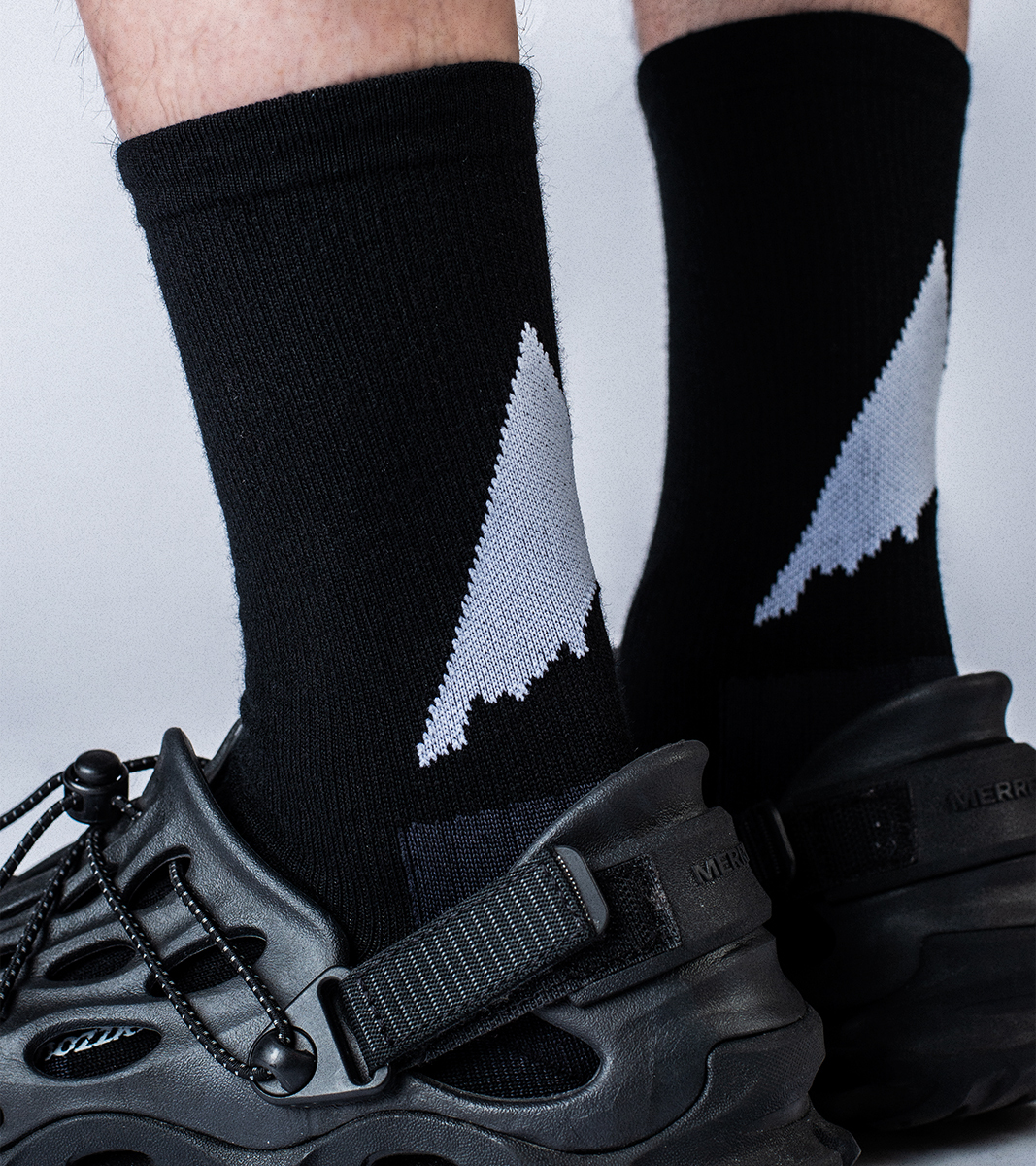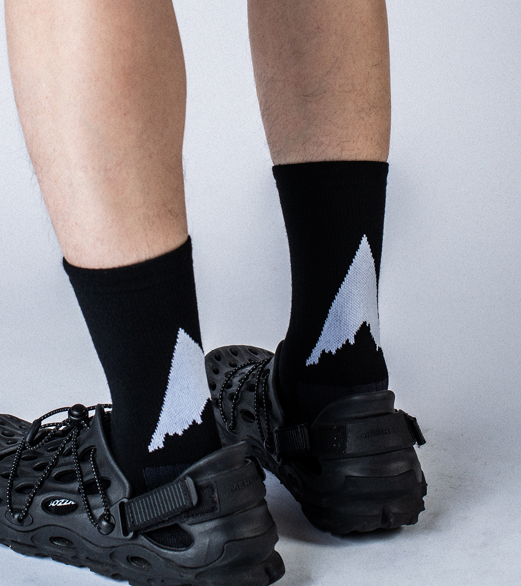這款羊毛襪從啟登的旅途出發,融合了指標圖像與山巒意象,成為鮮明的視覺焦點,新的品牌合作標誌以俐落帶有速度感的設計呈現,並使用廣受好評的矽膠轉印技術製作,細緻、有彈性且不易破損。