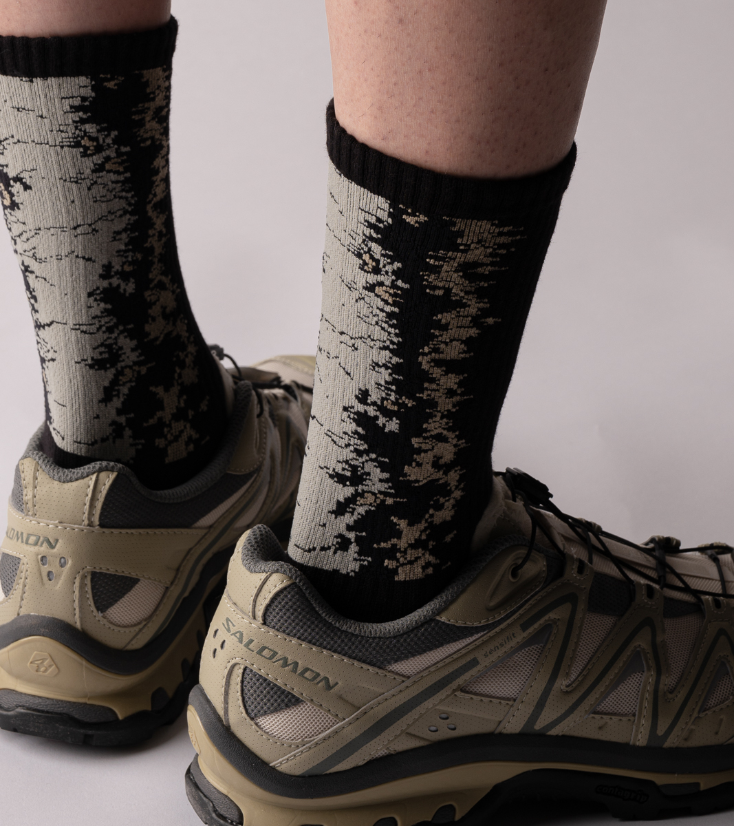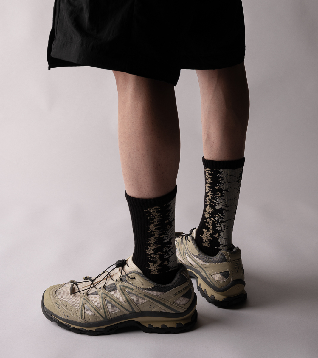 LANDING 系列延續漸層設計,本次帶來三種地貌形象,將麥田、海岸、沙洲融入,以環境型態呼應花紋,使色彩相互交錯,並在襪口內加入隱藏標語。 穿戴者如風砂般,在這不同氣溫、不同生態的環境中隨著空氣流動,探索世界的每個角落。
