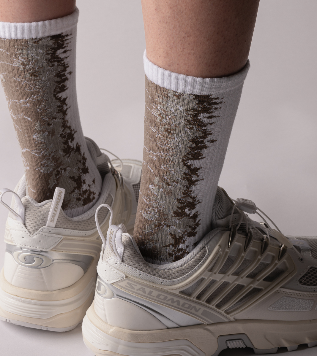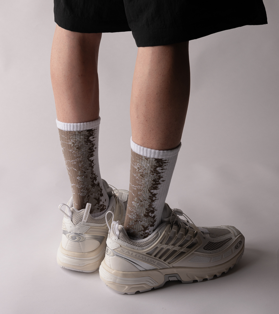 LANDING 系列延續漸層設計,本次帶來三種地貌形象,將麥田、海岸、沙洲融入,以環境型態呼應花紋,使色彩相互交錯,並在襪口內加入隱藏標語。 穿戴者如風砂般,在這不同氣溫、不同生態的環境中隨著空氣流動,探索世界的每個角落。