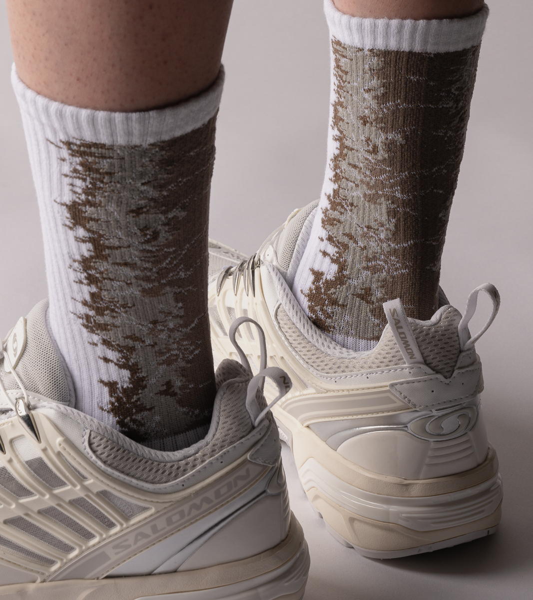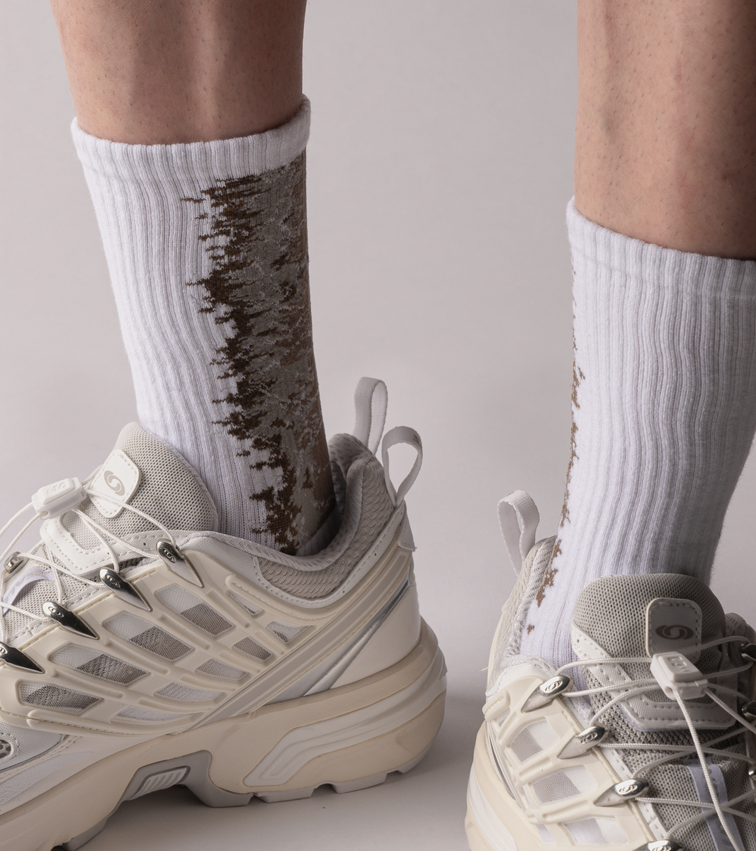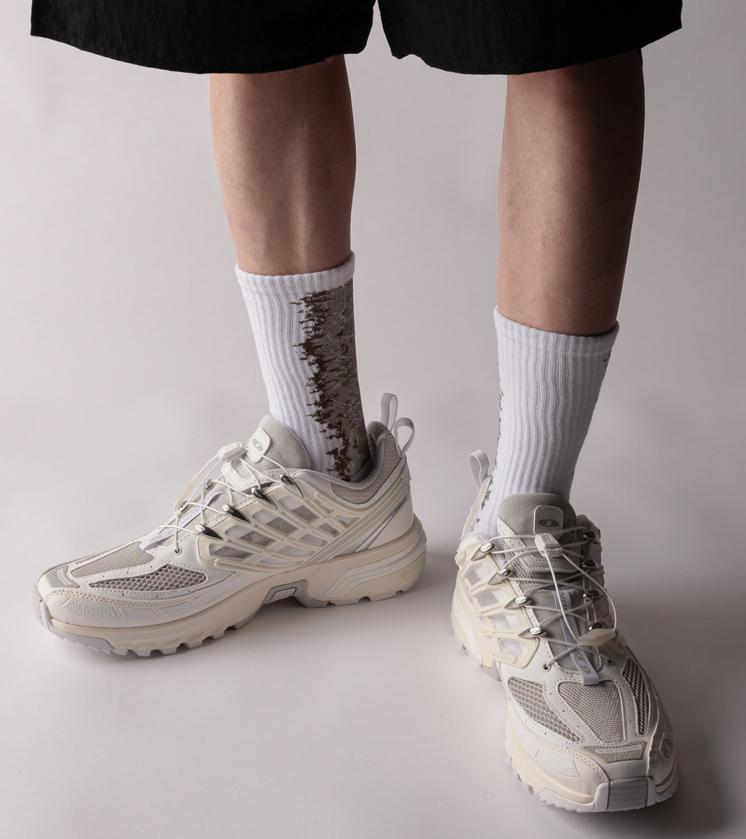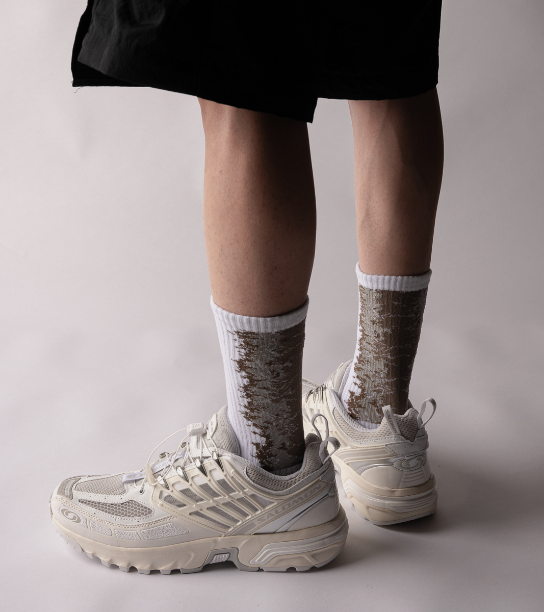 LANDING 系列延續漸層設計,本次帶來三種地貌形象,將麥田、海岸、沙洲融入,以環境型態呼應花紋,使色彩相互交錯,並在襪口內加入隱藏標語。