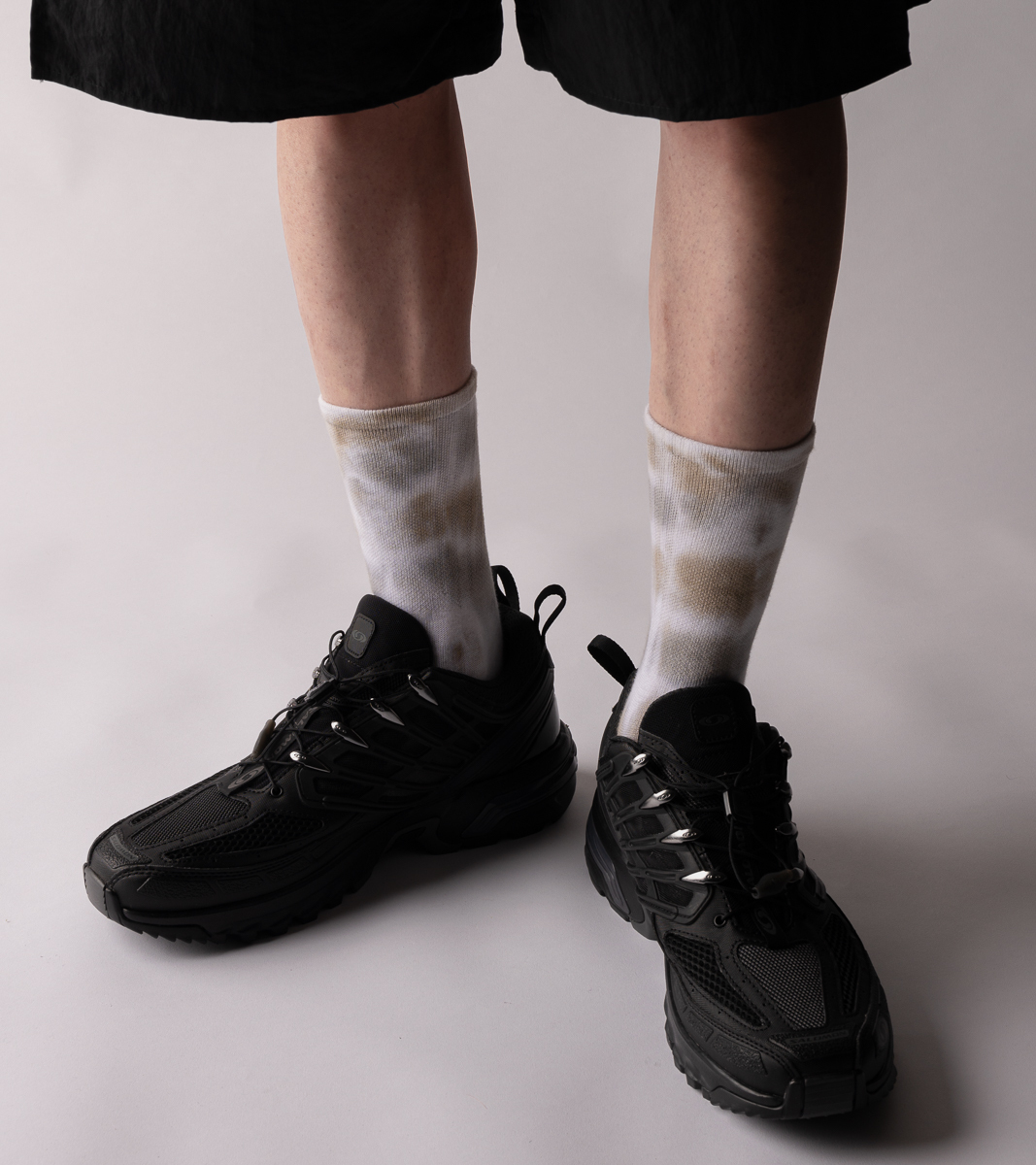 使用了以前從未嘗試過的技法和襪型設計。我們的師傅採用細心的手工方式,將色料以橫向滴染在每雙襪子上,接著讓顏料自然擴散,因此每雙襪子的花紋都是獨一無二的,呈現出令人驚豔的效果。