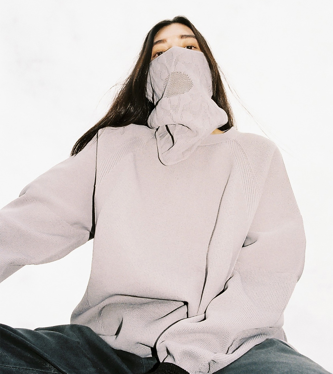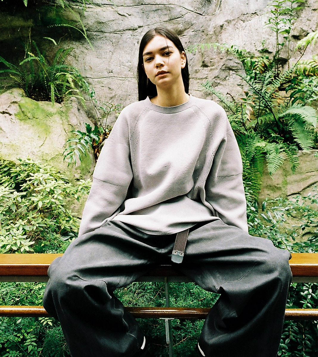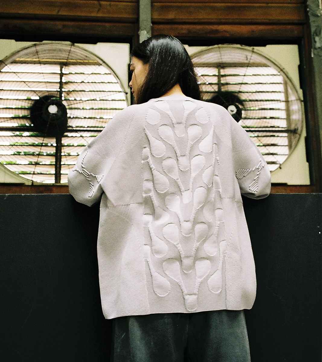 此款全成形毛衣,整件正面簡潔充滿細節,背後搭配解構後的 V 形 LOGO 字樣,運用了多組針織技法藏入拼接細節中,袖子後側也插入了有別以往了立體組織,具有強烈的識別度。
