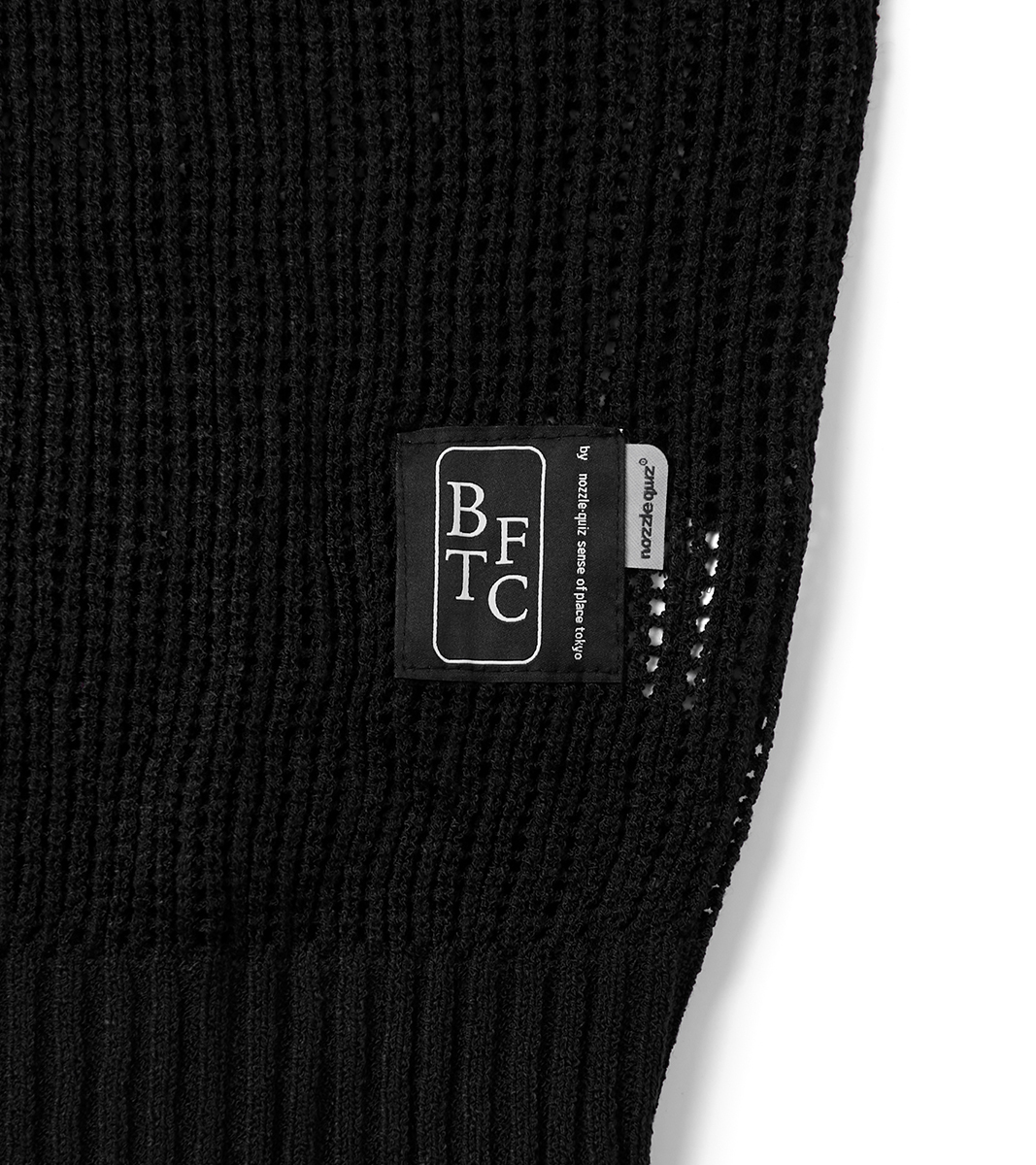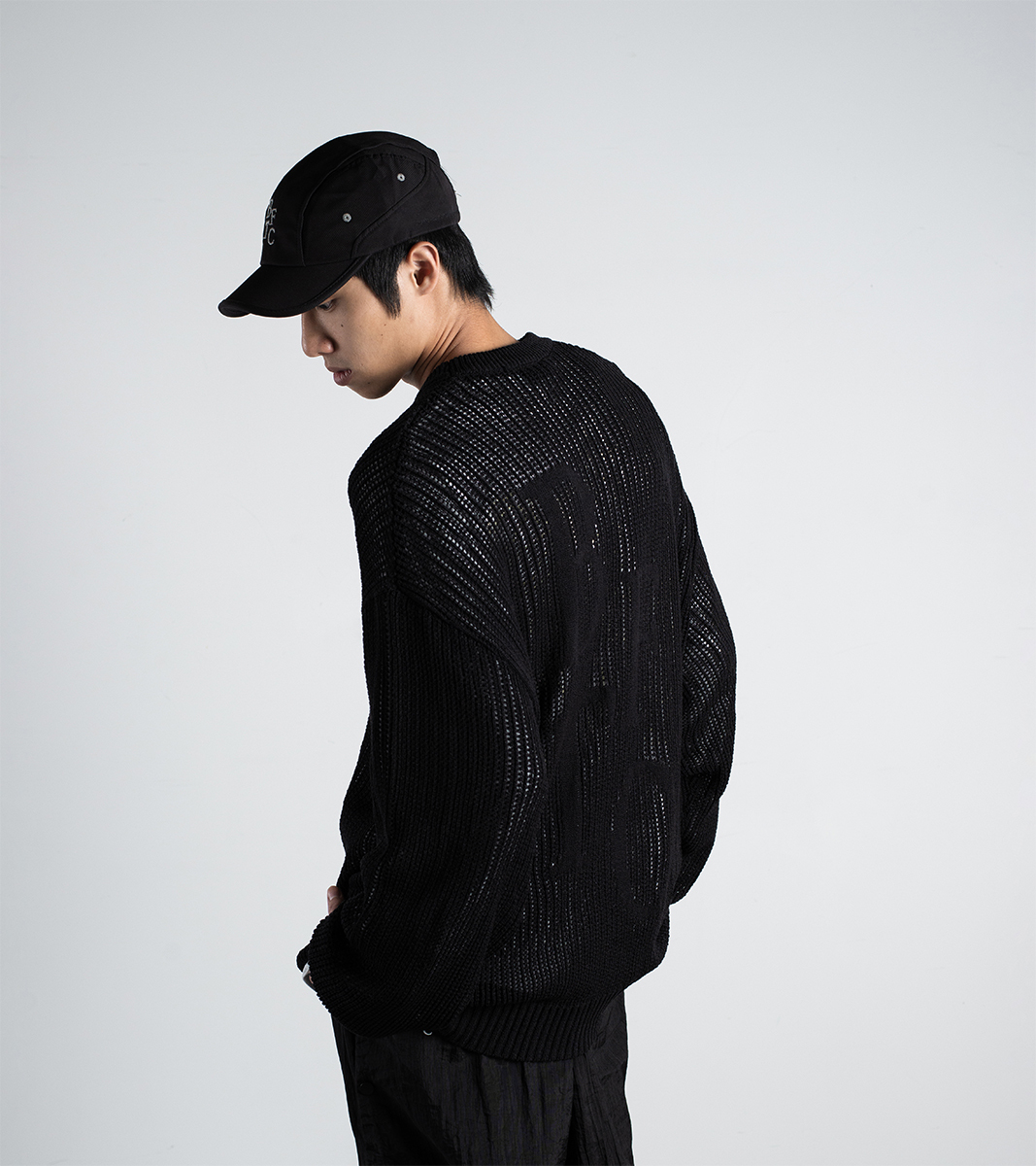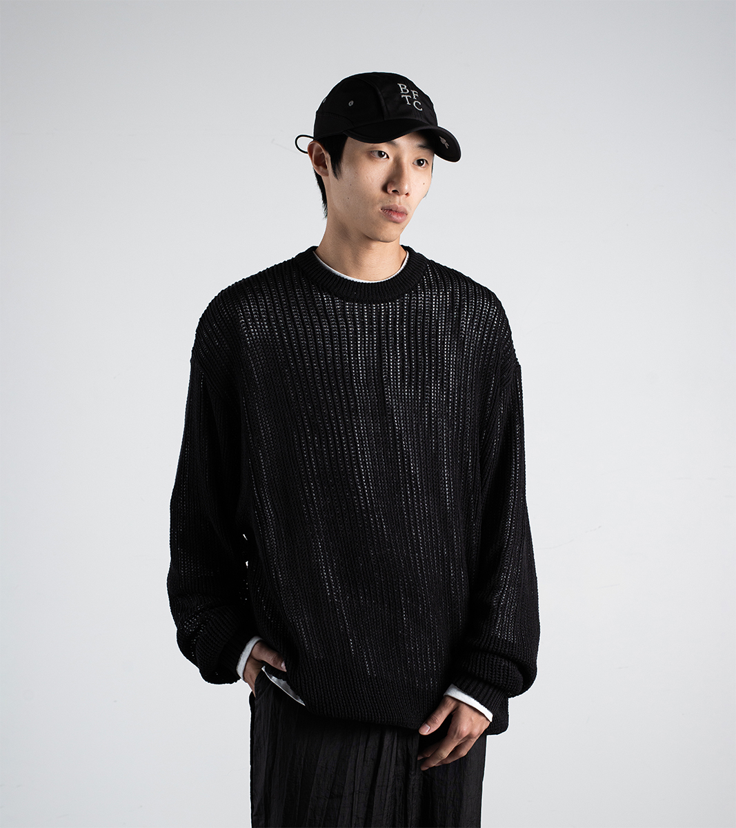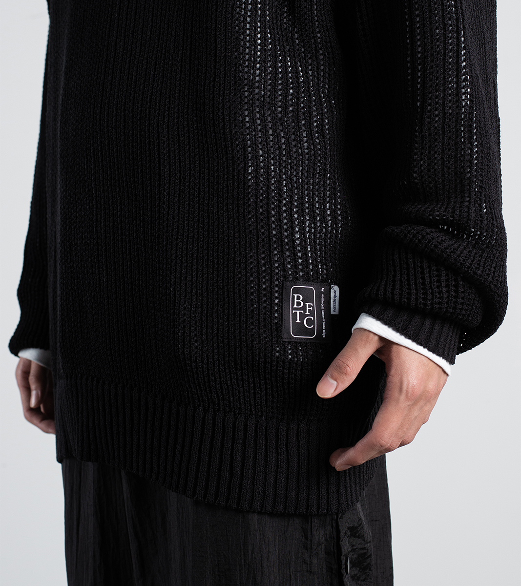 針織毛衣以開口網狀的 oversized 搭配背部 “BTFC” 提花,寬鬆的版型在穿著上舒適自在,並為穿搭增添層次感。