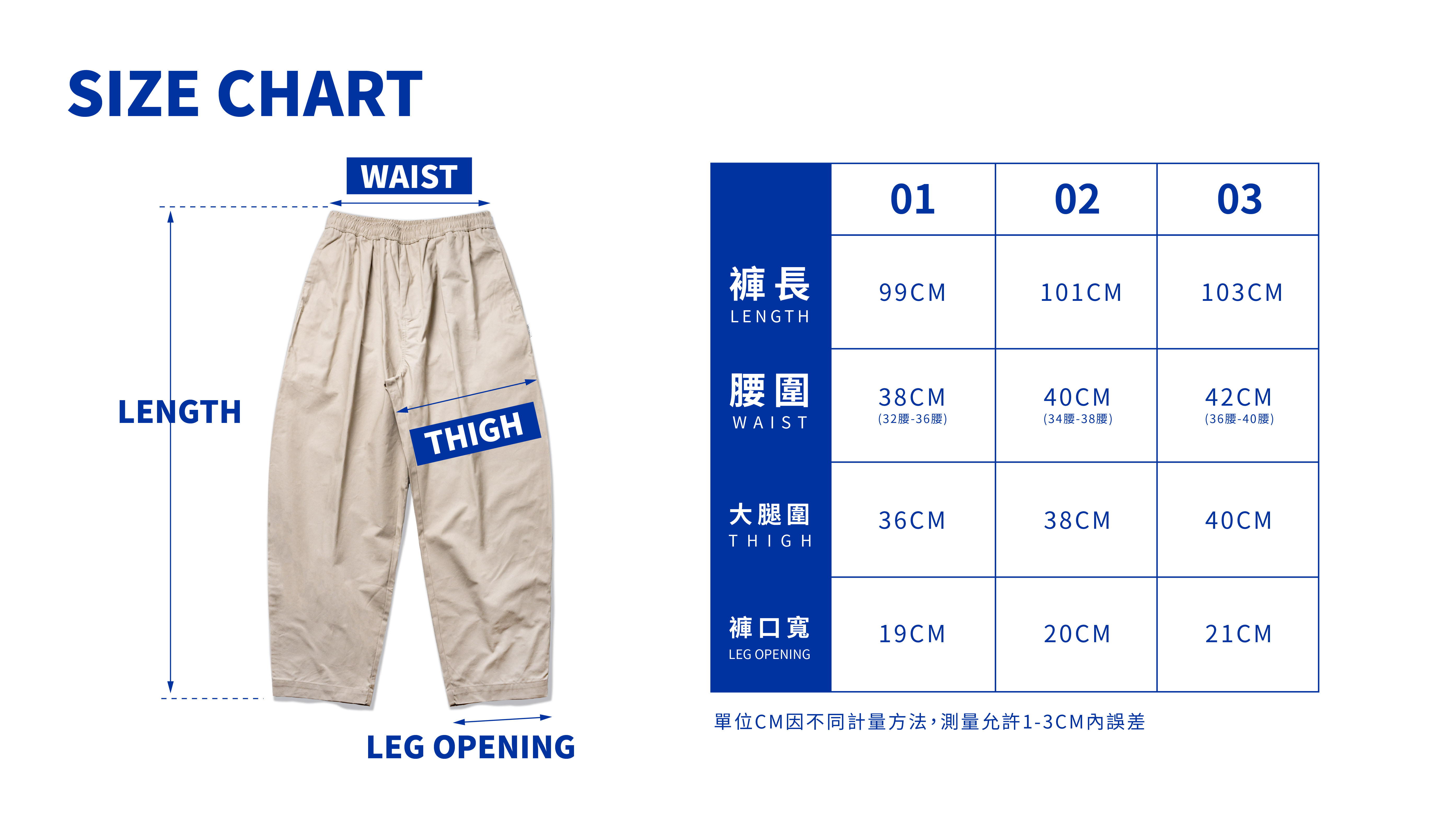 01:褲長99cm/腰圍38cm/大腿寬36cm/褲口寬19cm