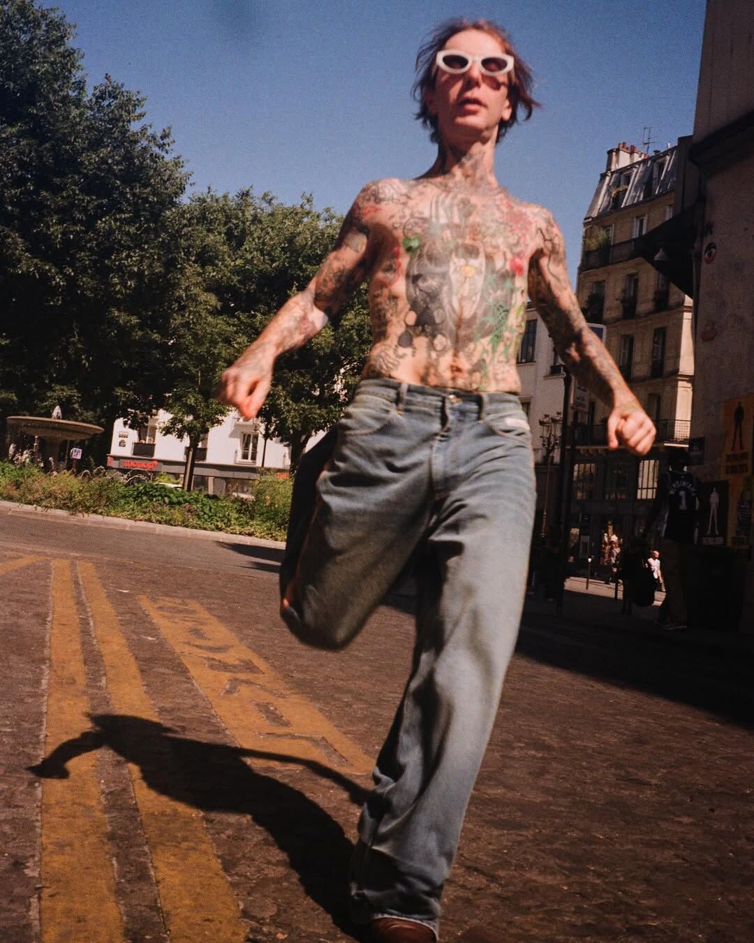 經石洗處理,呈現自然質地。以布料拼接構成視覺層次,搭配層次褲口設計,強化整體輪廓表現。