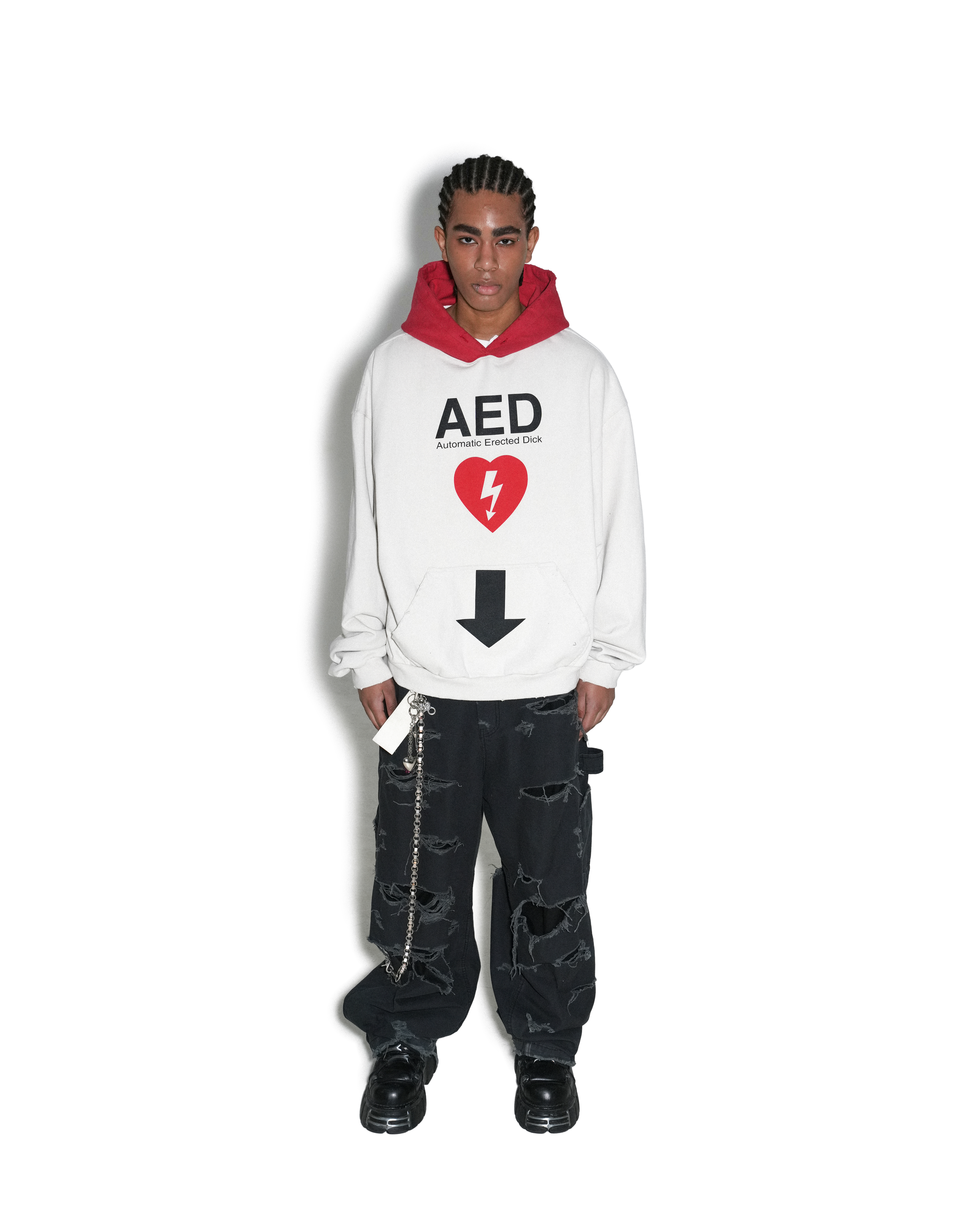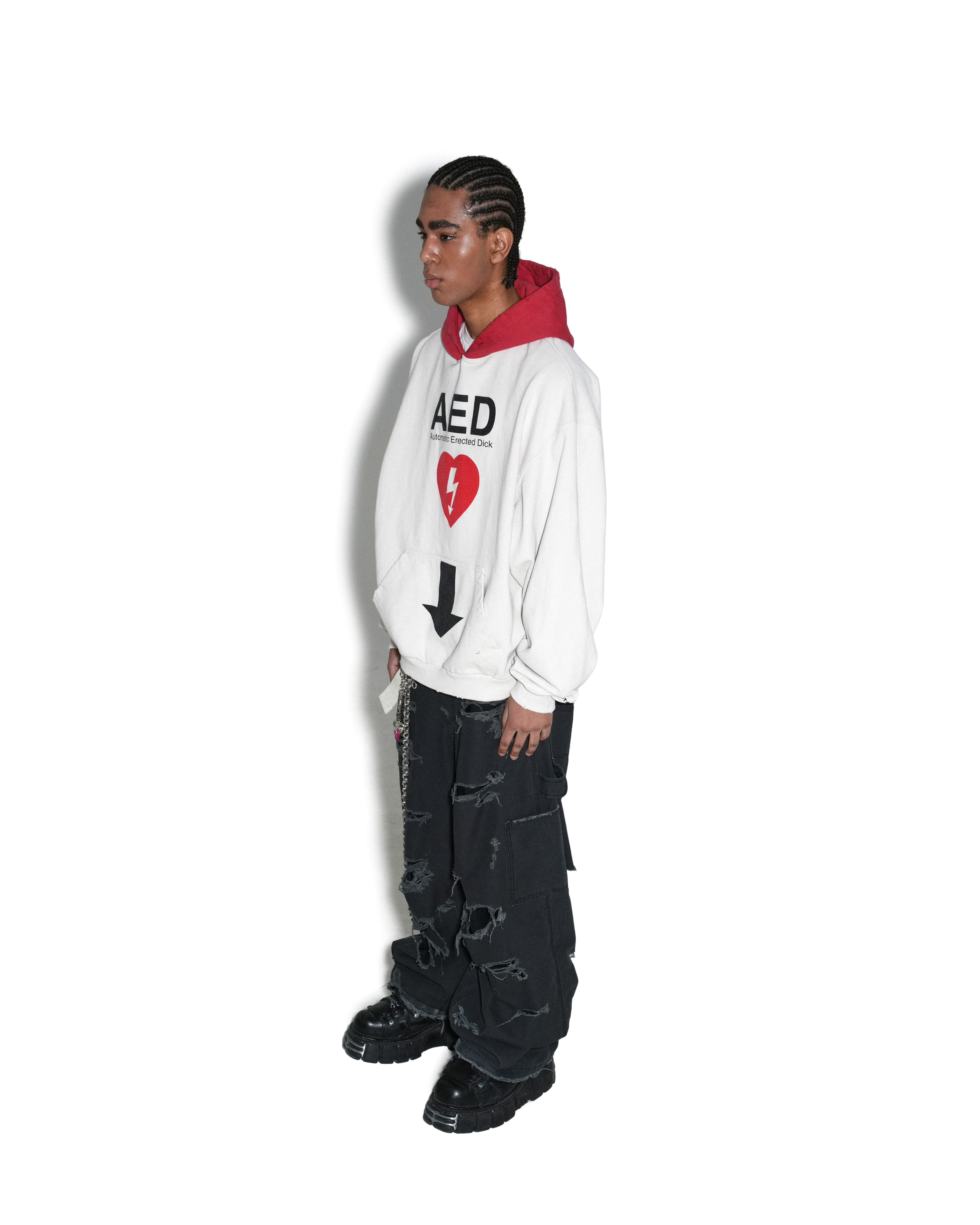 本季工裝褲採用 100% 純棉材質,搭配破壞細節與多功能工裝配置,混合未完成感與實用主義,展現街頭實驗風格。